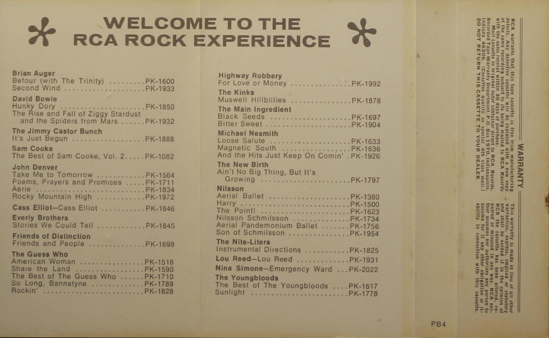 Black lower third cover, spine and rear panel.he cover is on single sheet treated, perforated light card. Black ink printed directly onto a grey shell with solid black RCA logo. The rear cover is blank. The back panel states ‘Previously released as AQK1- 0291’, which I have never seen and may be a misprint for APK1- 0291. There are cassette shell variations.