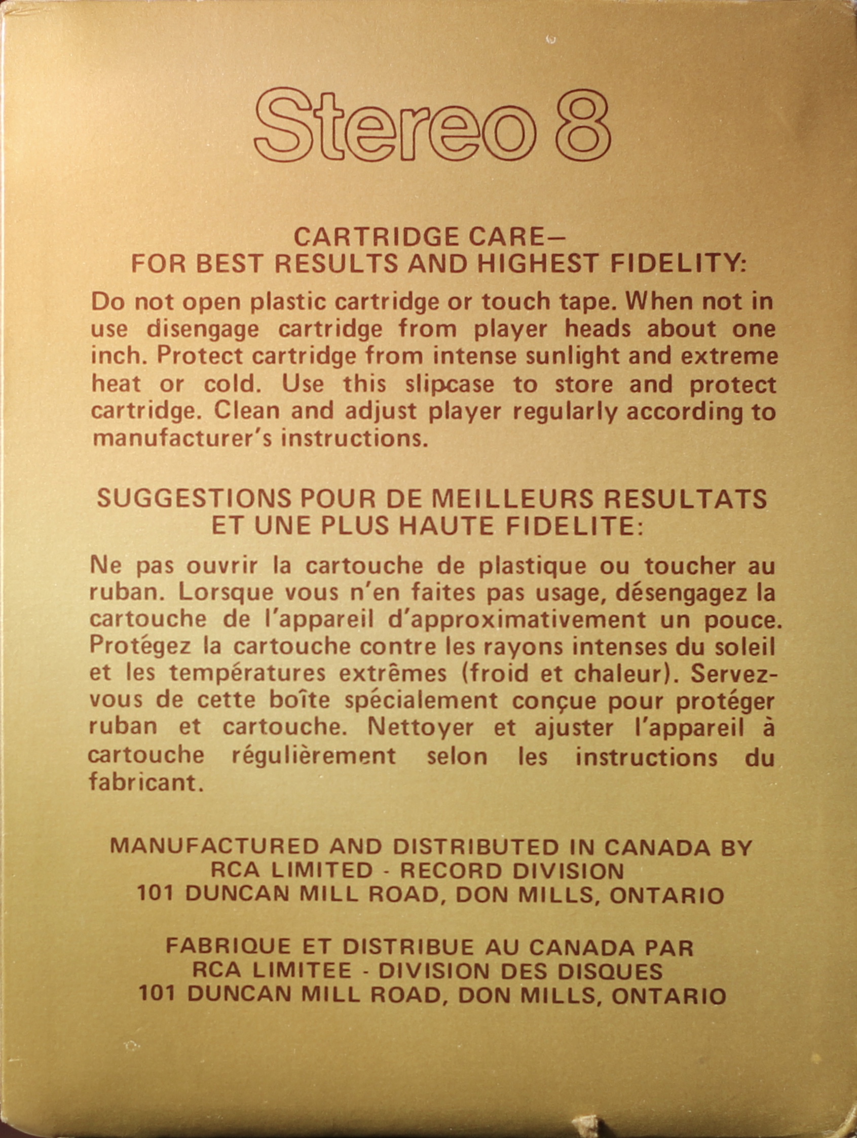 Gold box sleeve with black border to cover picture. ‘RCA’ on the top of the front panel and the top and side panels show ‘Stereo 8’. Warranty and Care information is on the rear sleeve.