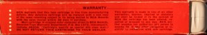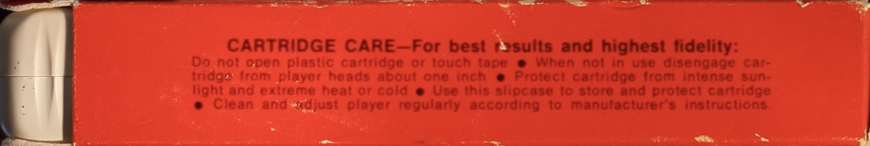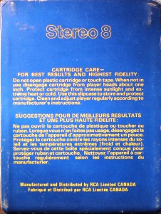 Red box sleeve with white border to cover picture. ‘Stereo 8’ on the top of the front panel and and the top panel and RCA logo on the bottom front panel. The side panels show Warranty and Care information on alternate sides.