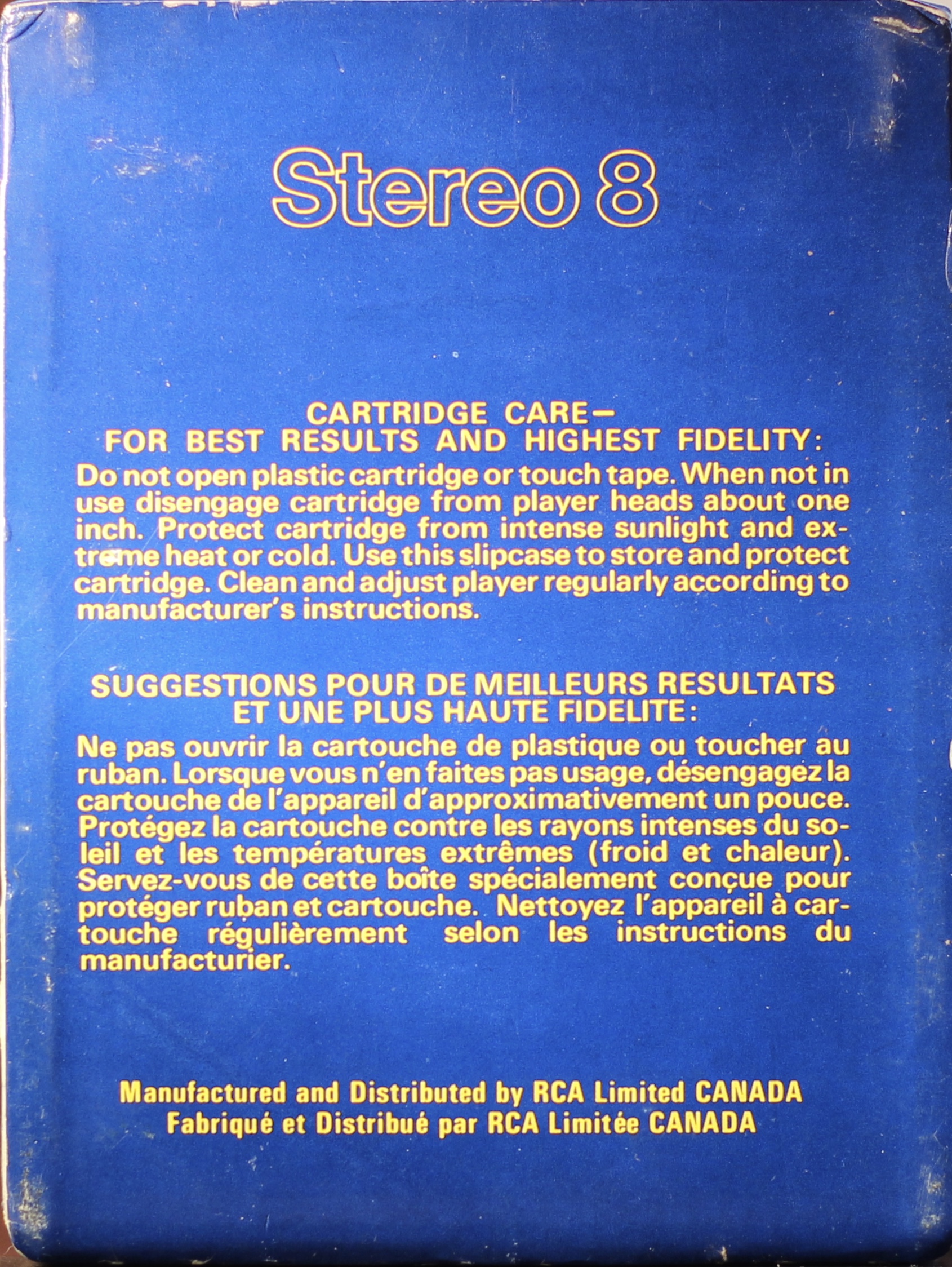 Blue box sleeve with yellow border to cover picture. ‘Stereo 8’ on the top of the front panel and and the top panel. The side panels show ‘Stereo 8’. Warranty and Care information is on the rear sleeve.