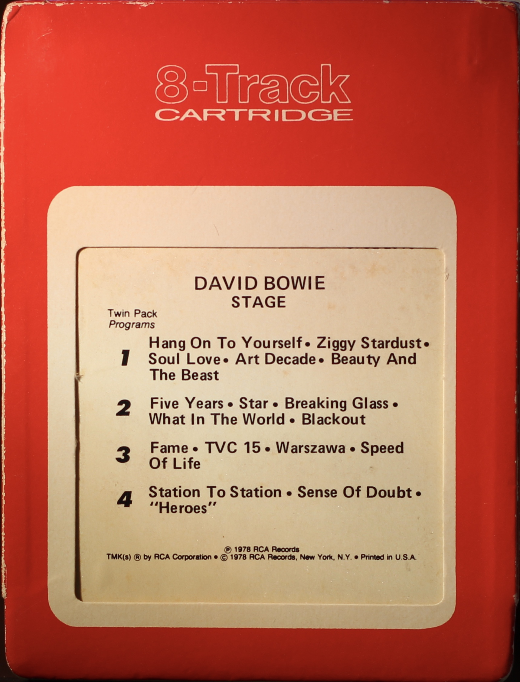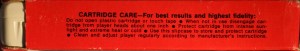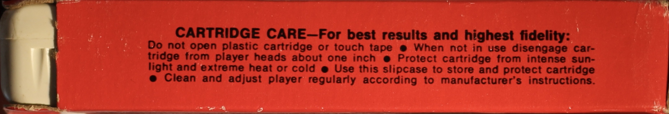 Red box sleeve with white border to cover picture. ‘8 Track Cartridge’ on the top of the front panel and and the top panel and RCA logo on the bottom front panel. The side panels have one Care Information and one blank sides.