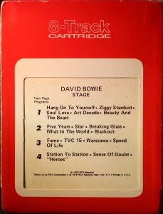 White 8 Track stereo cartridge with cover picture on the front and track running order on the rear.