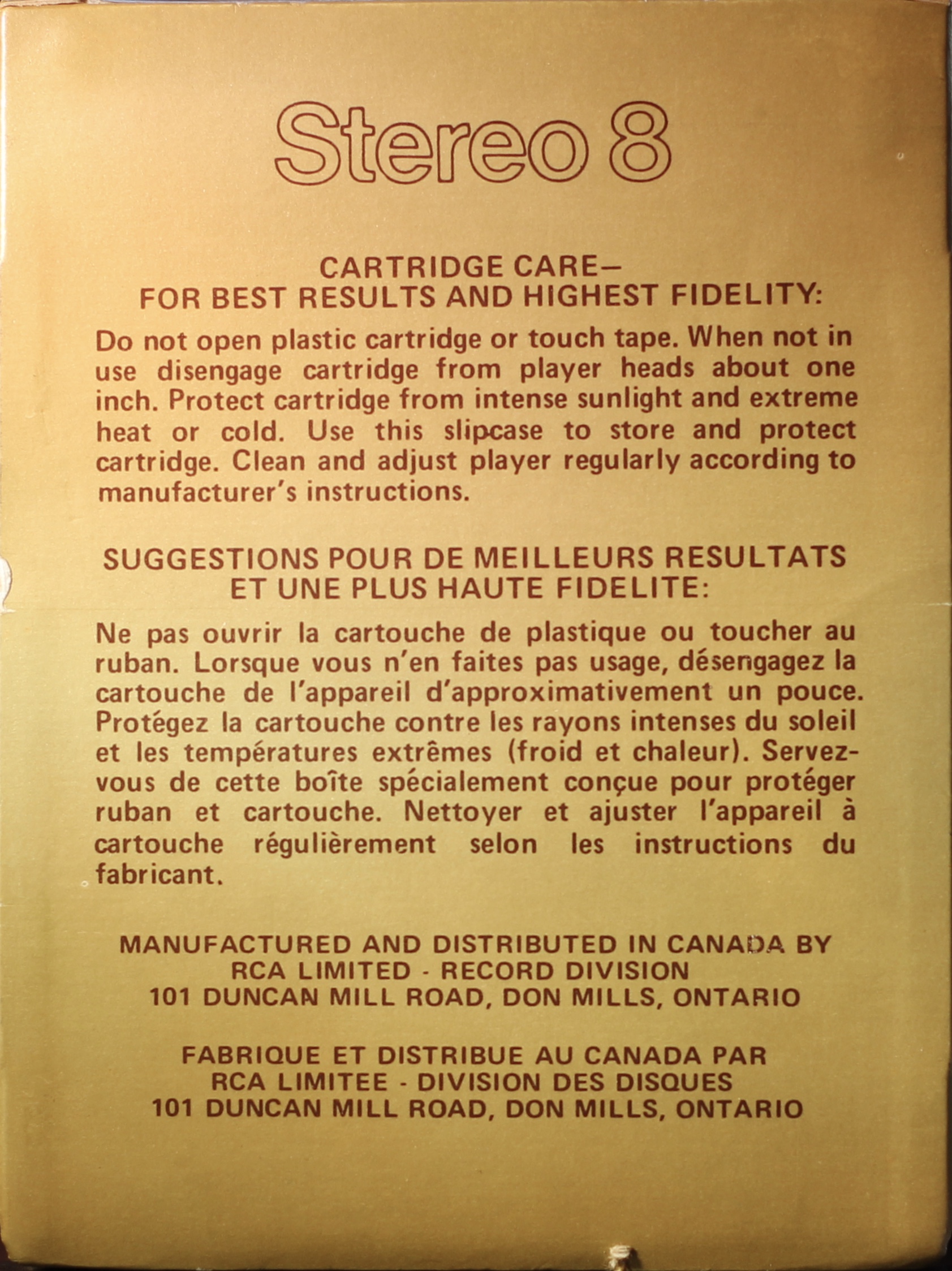 Red box sleeve with white border to cover picture. ‘Stereo 8’ on the top of the front panel and and the top panel and RCA logo on the bottom front panel. The side panels have one Care Information and one blank sides.