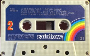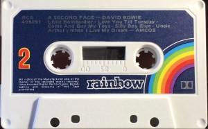 Silver ink on blue paper ‘Rainbow’ label onto grey shell; AMCOS rights and Dolby sign. Shell variants exist.