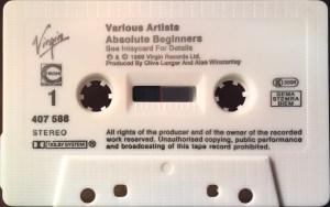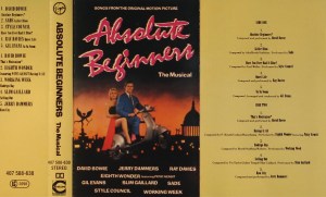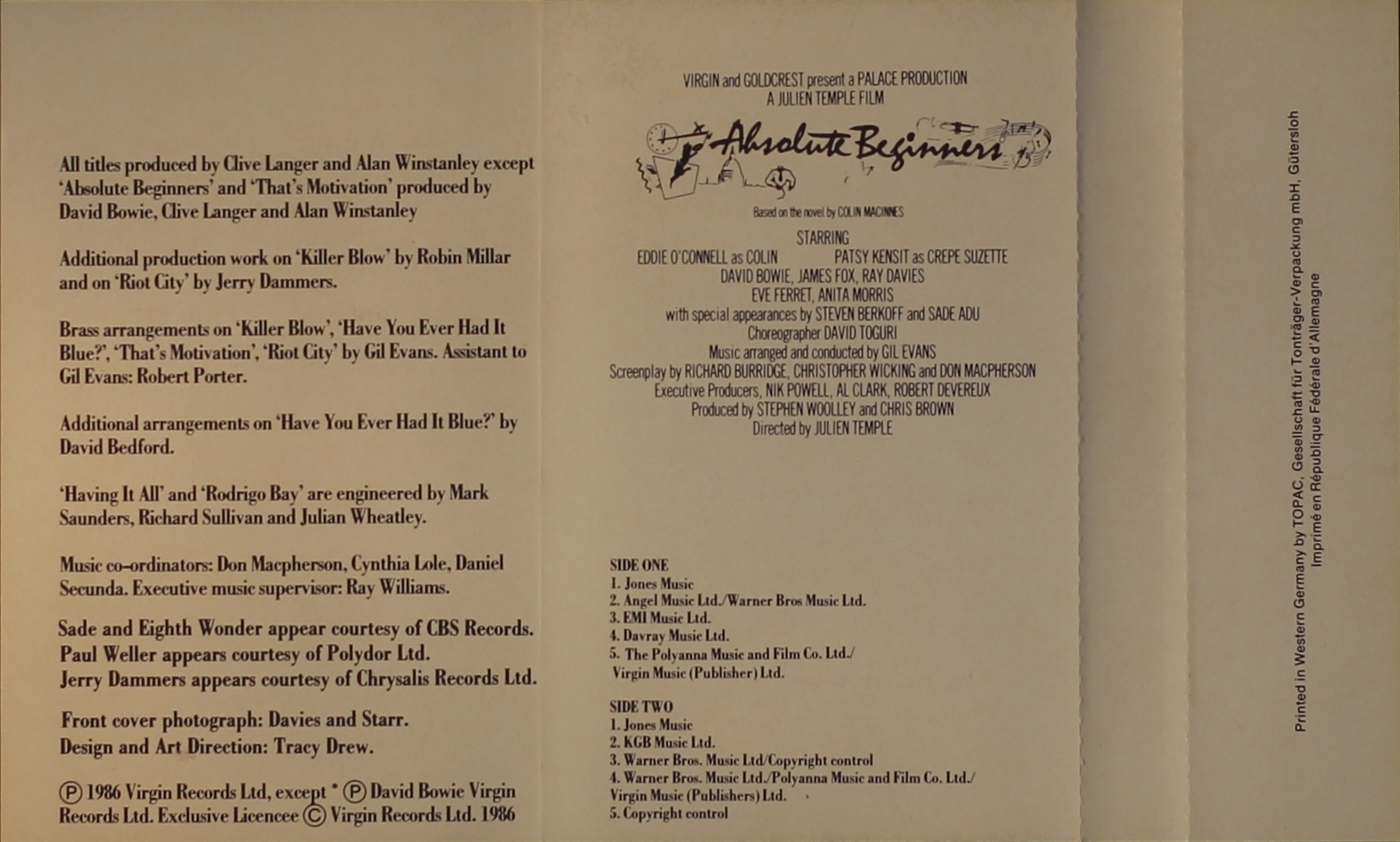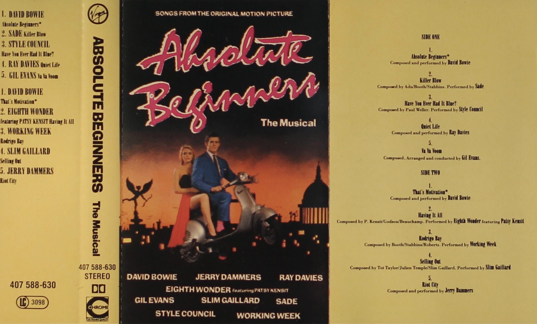 10 track abbreviated soundtrack cassette. David Bowie performs on two tracks: ‘Absolute Beginners’ on Side 1, and ‘That’s Motivation’ on Side 2.