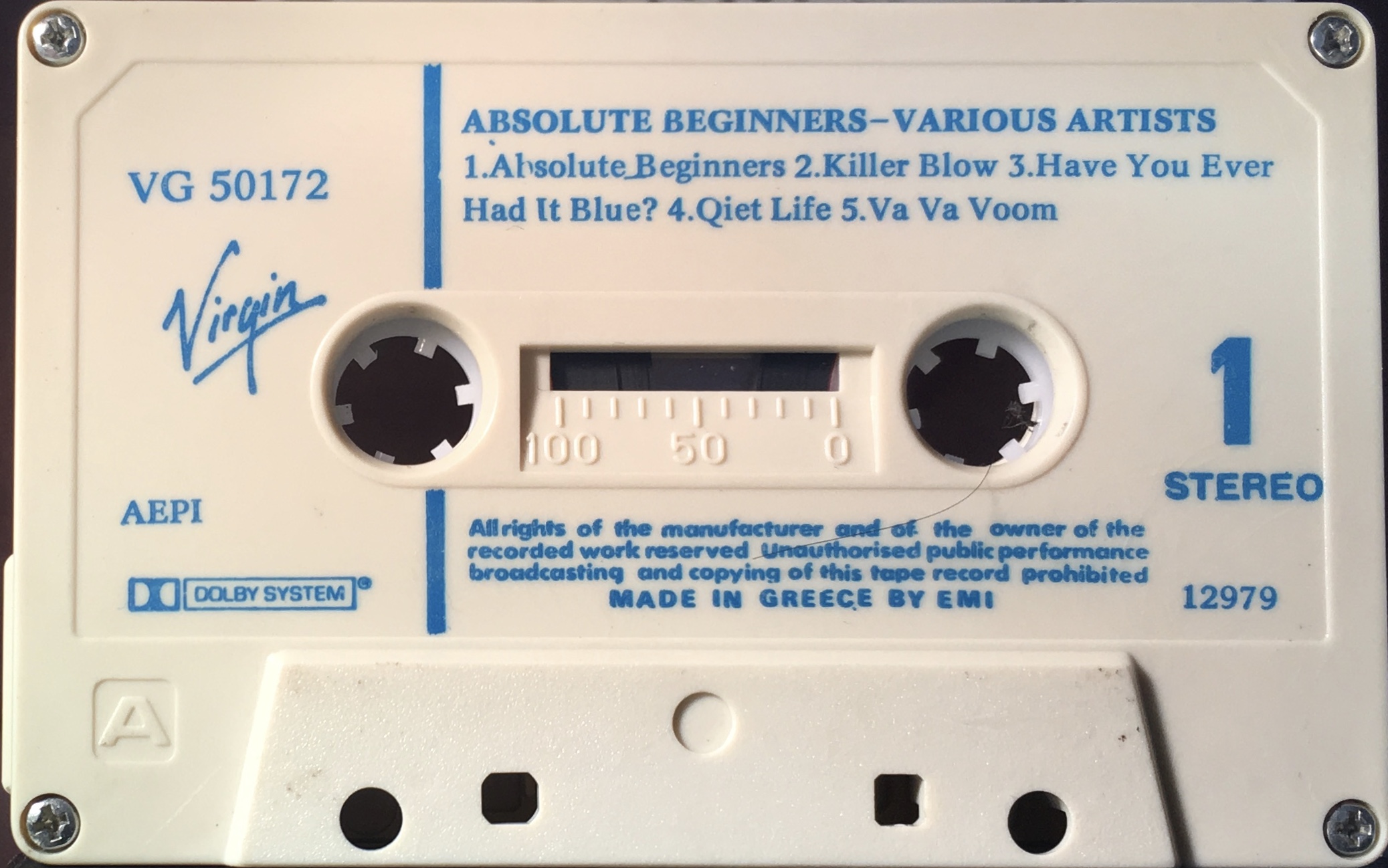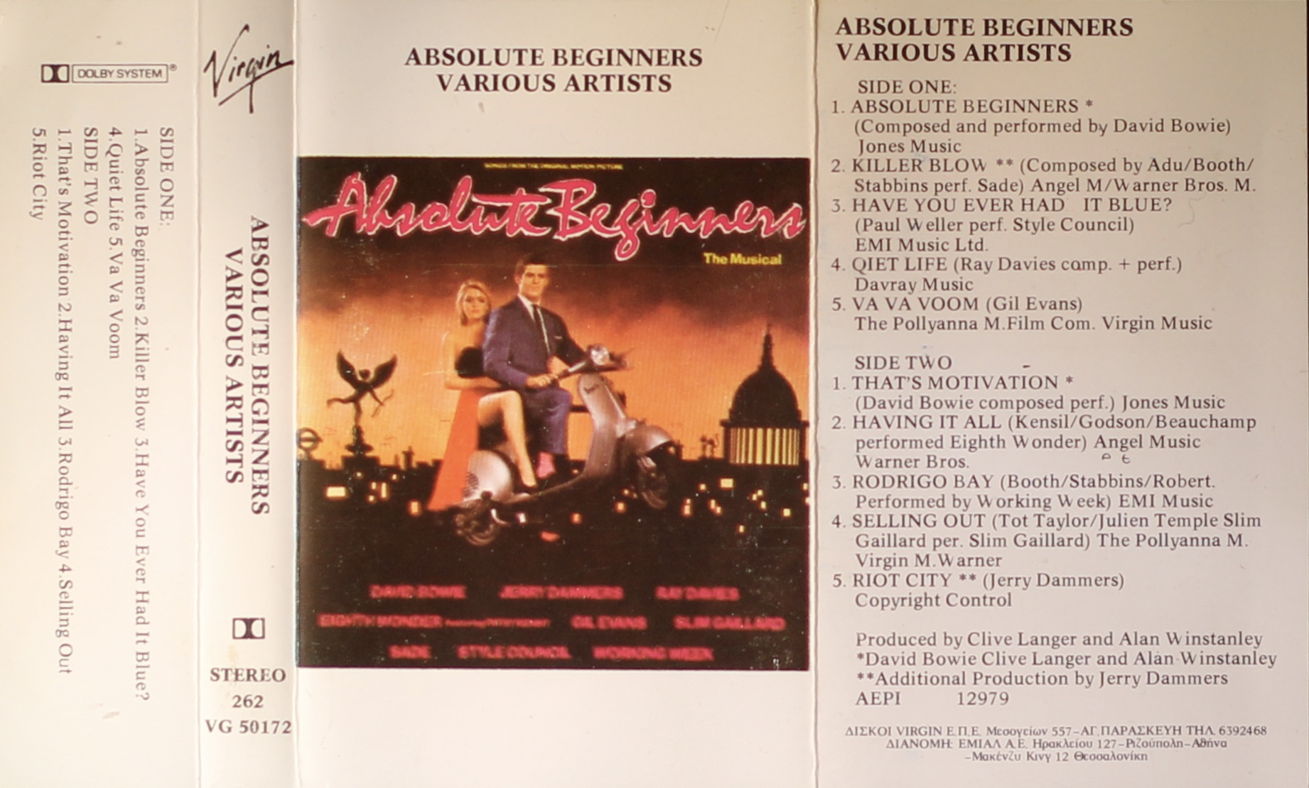 10 track abbreviated soundtrack cassette. David Bowie performs on two tracks: ‘Absolute Beginners’ on Side 1, and ‘That’s Motivation’ on Side 2.