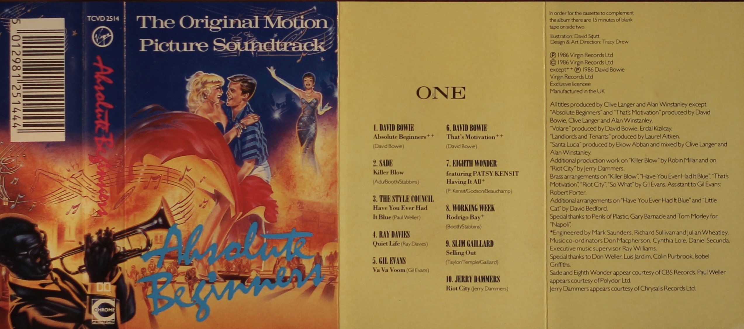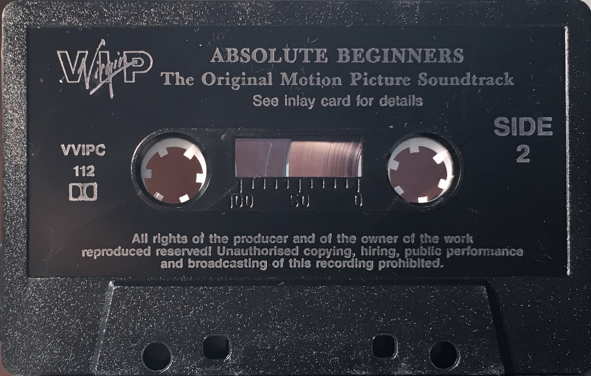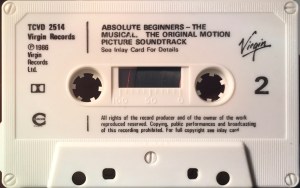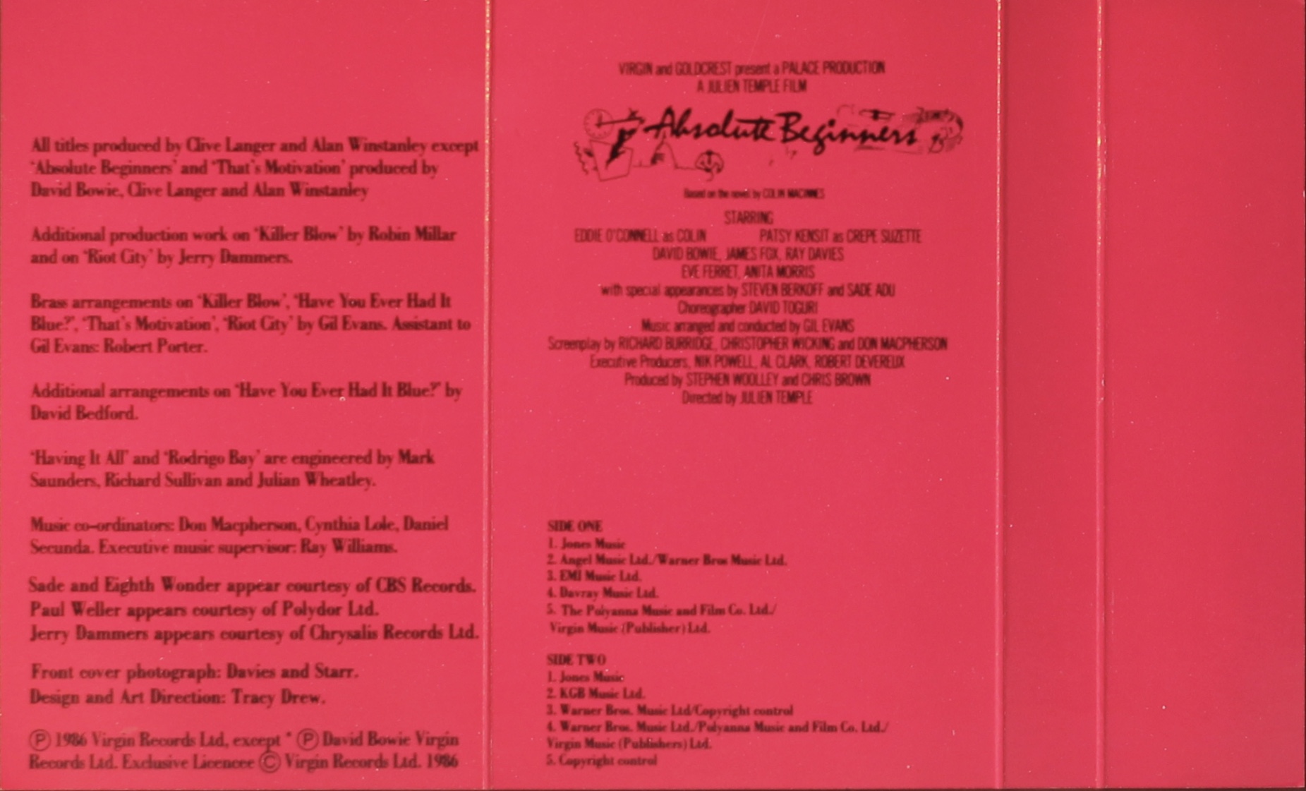 10 track abbreviated soundtrack cassette. David Bowie performs on two tracks: ‘Absolute Beginners’ on Side 1, and ‘That’s Motivation’ on Side 2.