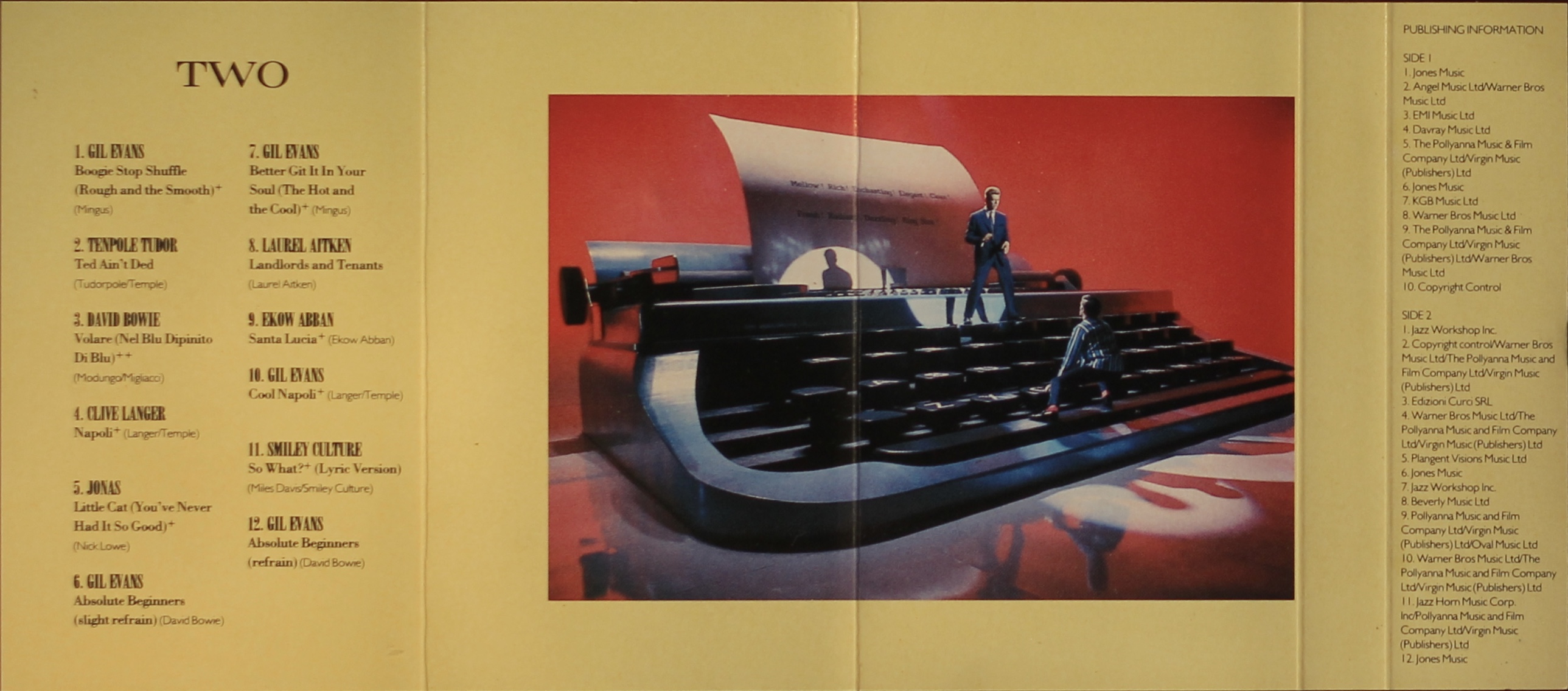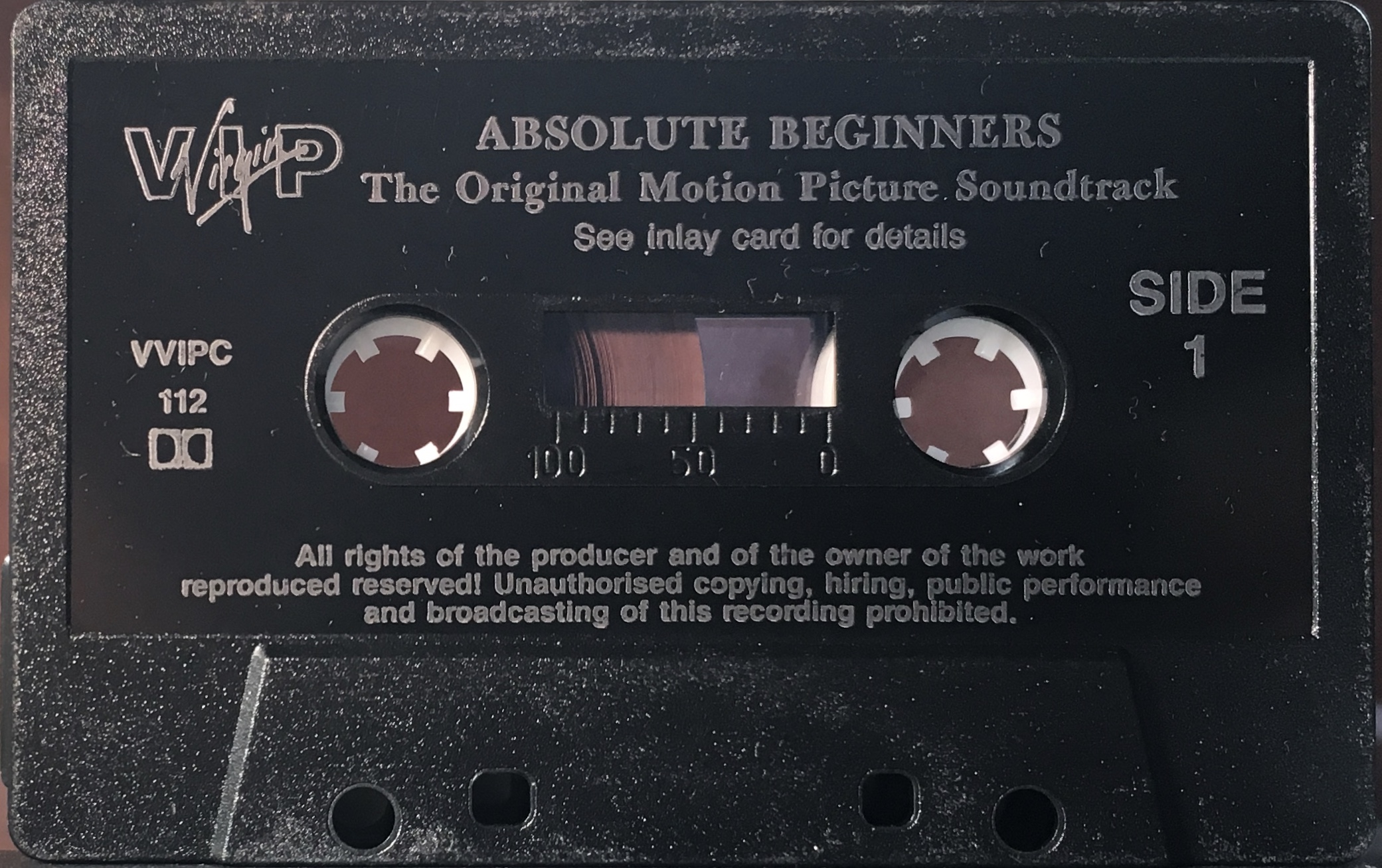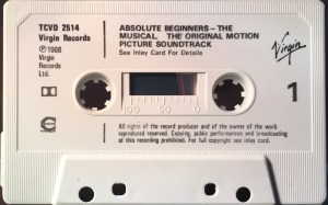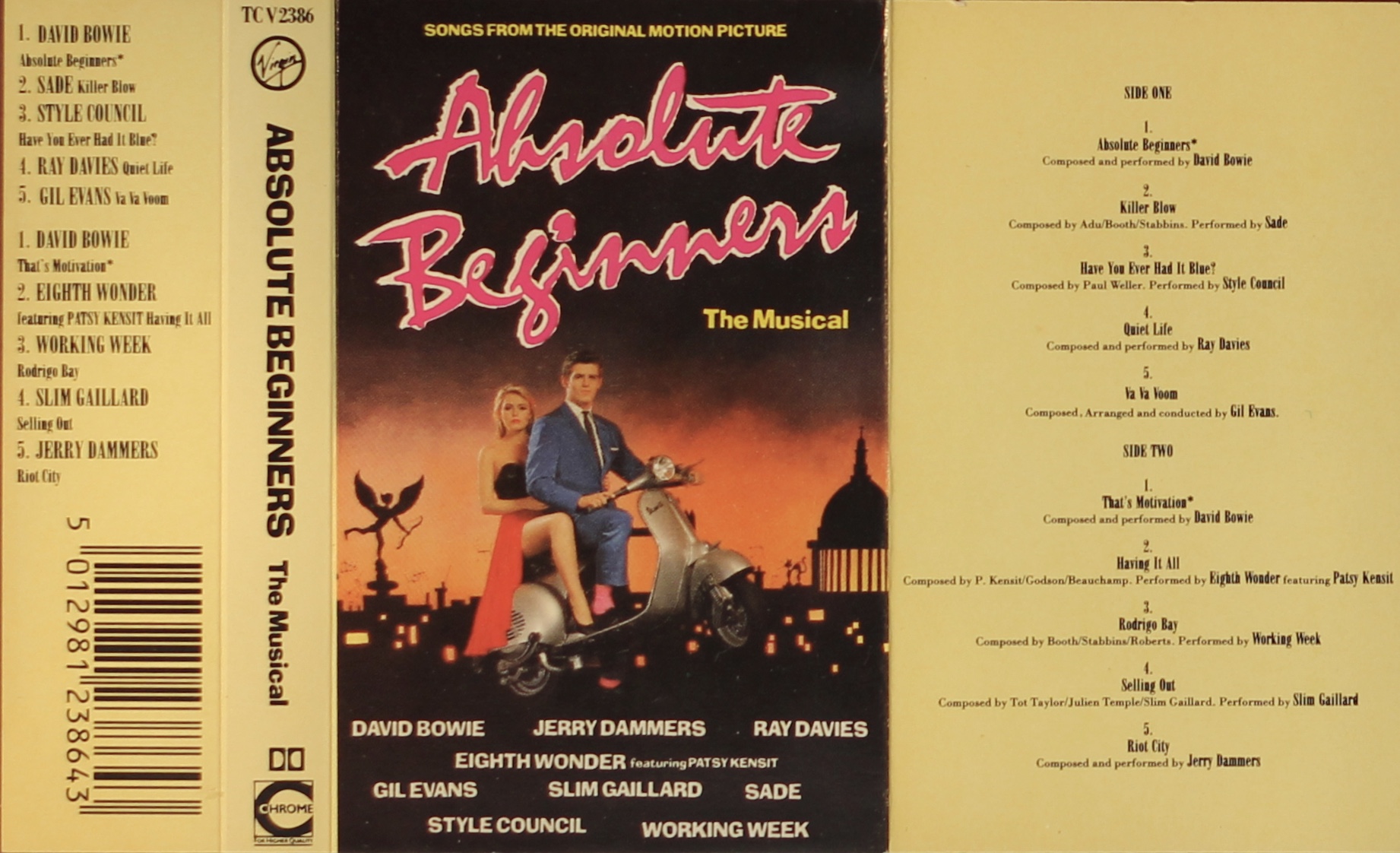 10 track abbreviated soundtrack cassette. David Bowie performs on two tracks: ‘Absolute Beginners’ on Side 1, and ‘That’s Motivation’ on Side 2.