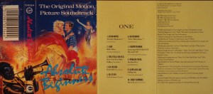 Full photo cover with yellow spine, inner and rear half-panel. Folded, thick glossy paper with track list on the inner and rear panels. Movie information on the pink coloured inside panels. ‘Virgin’ and ‘Chrome’ logos on spine.