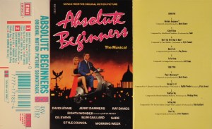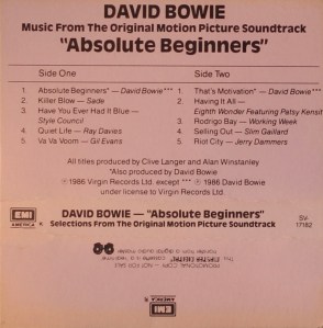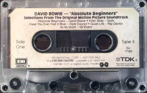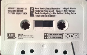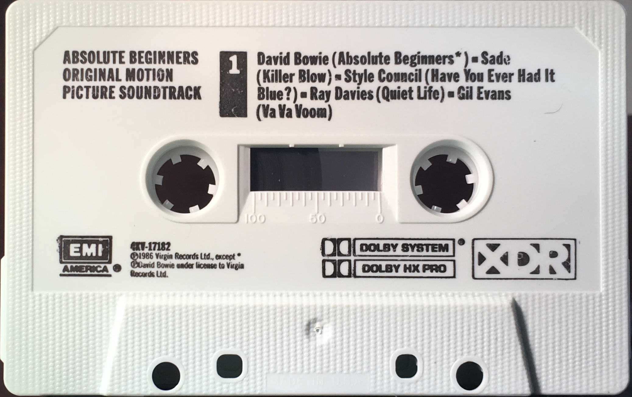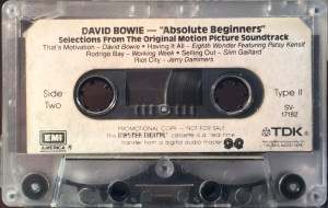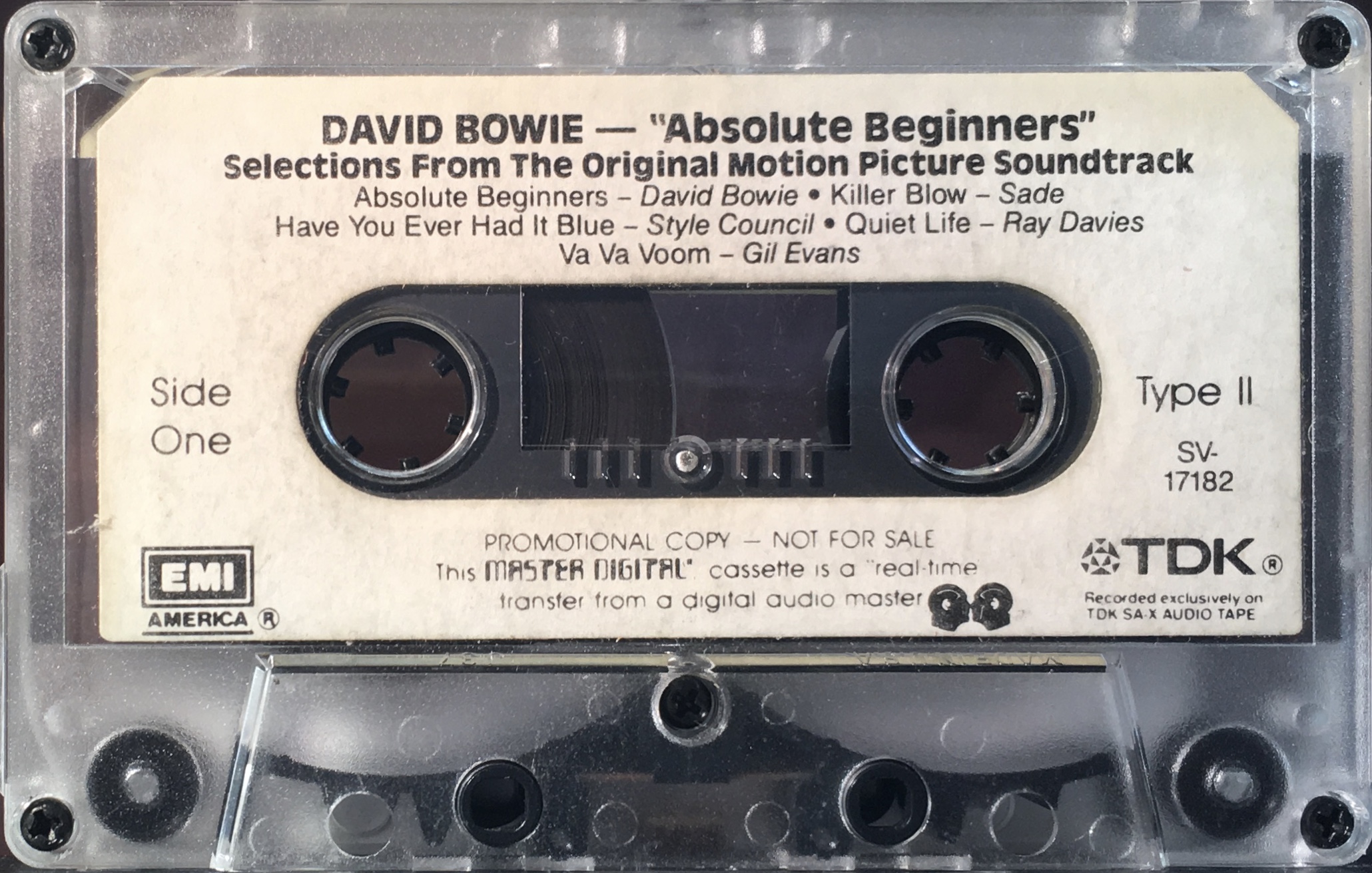 10 track abbreviated soundtrack cassette. David Bowie performs on two tracks: ‘Absolute Beginners’ on Side 1, and ‘That’s Motivation’ on Side 2.