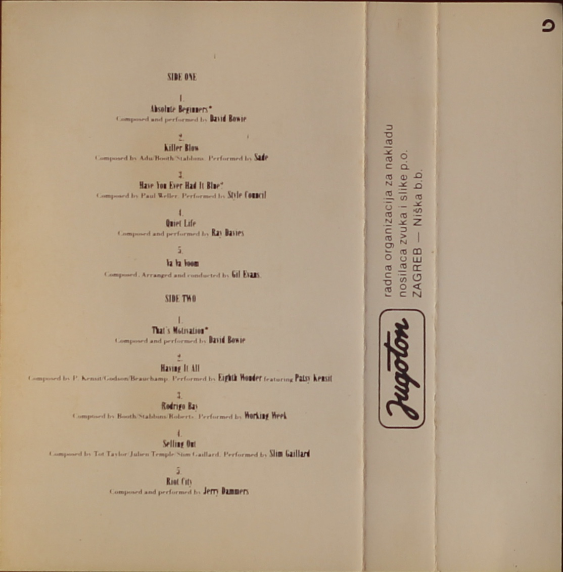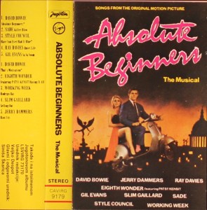 10 track abbreviated soundtrack cassette. David Bowie performs on two tracks: ‘Absolute Beginners’ on Side 1, and ‘That’s Motivation’ on Side 2.