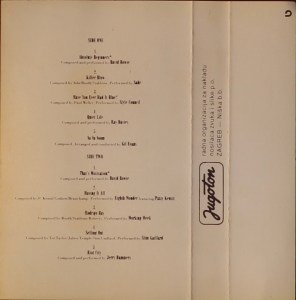 Full photo cover with yellow spine and rear half-panel. Folded, treated, card with track list on the inner and rear half-panels. Album information in Serbo-Croat on rear half-panel, Jugoton information on the inside of the spine.