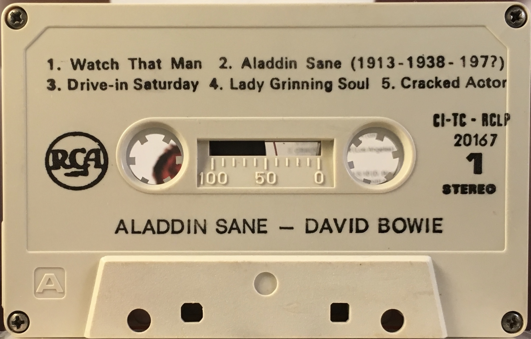 Side 1: Watch That Man; Aladdin Sane (1913-1938-197?); Drive-in Saturday; Lady Grinning Soul; Cracked Actor.