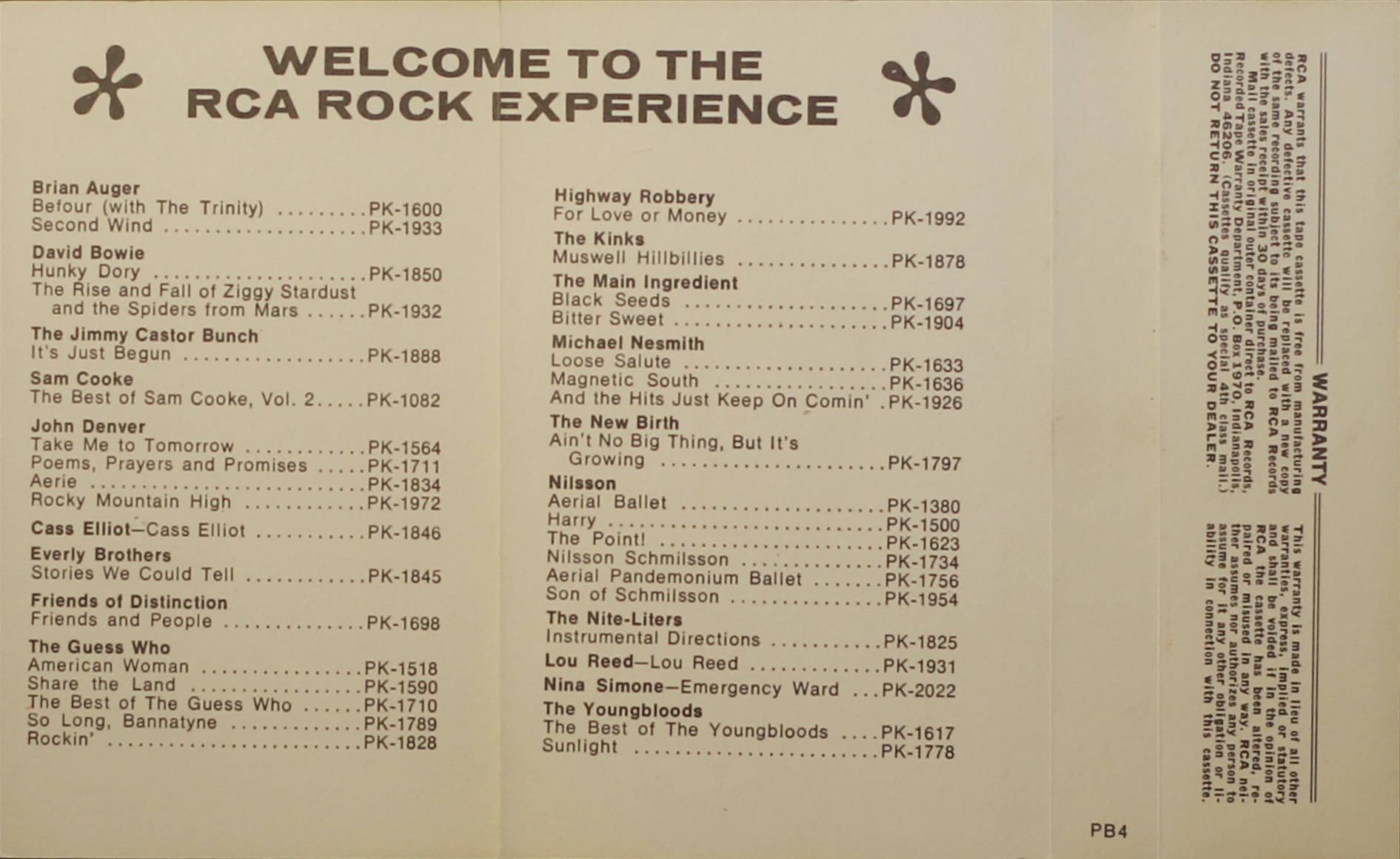 White cover, black spine and rear panel on single sheet folded, glossy, perforated paper. Inner cover information box is lilac. Rear of cover is blank. Black ink printed directly onto a grey shell with solid black RCA logo. There are cassette shell variations.