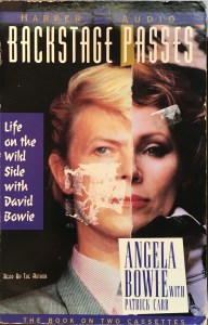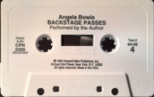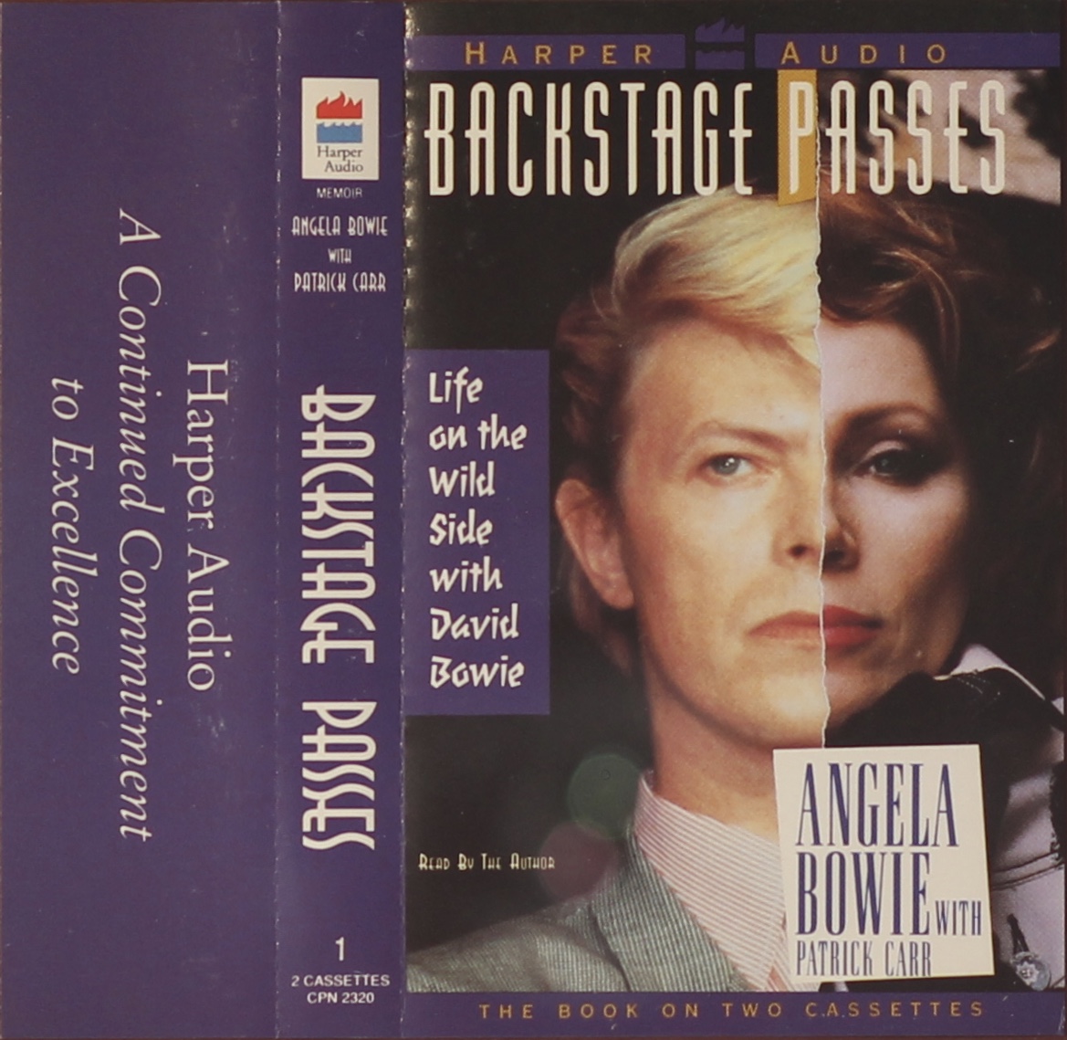 Angie Bowie Angela Bowie. ‘Backstage Passes’: USA; Harper Audio, CPN 2320; 1993. Audio Book. Angela Bowie with Patrick Carr. Two cassettes in a book-like cover. Black ink printed directly to white shell. Share this: Click to share on X (Opens in new window) X Click to share on Facebook (Opens in new window) Facebook Like Loading...