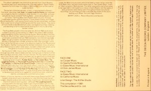 Full size ‘Rock Echoes’ cover photograph; white spine, inner and rear panels on stiff, glossy paper. Track list on rear and inner panels. Period biography by Barry Lazell on inner panels.