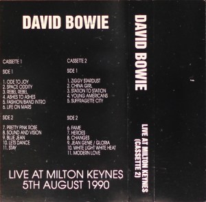 Side 1: Intro (Ode To Joy)/Space Oddity; Rebel Rebel; Ashes To Ashes; Fashion/ Band Intro; Life On Mars?; Pretty Pink Rose; Sound & Vision; Blue Jean; Let’s Dance; Stay.