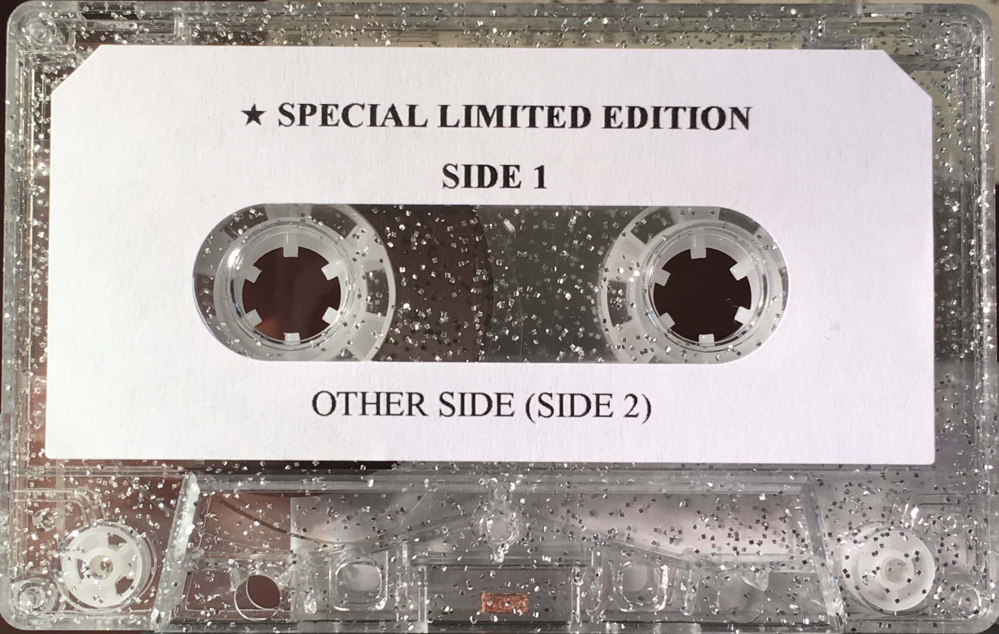 Limited edition cassette only release with full art printed cover; custom labels on glitter filed clear shell and track list insert. This cassette comes in a clever single piece fold-together cover