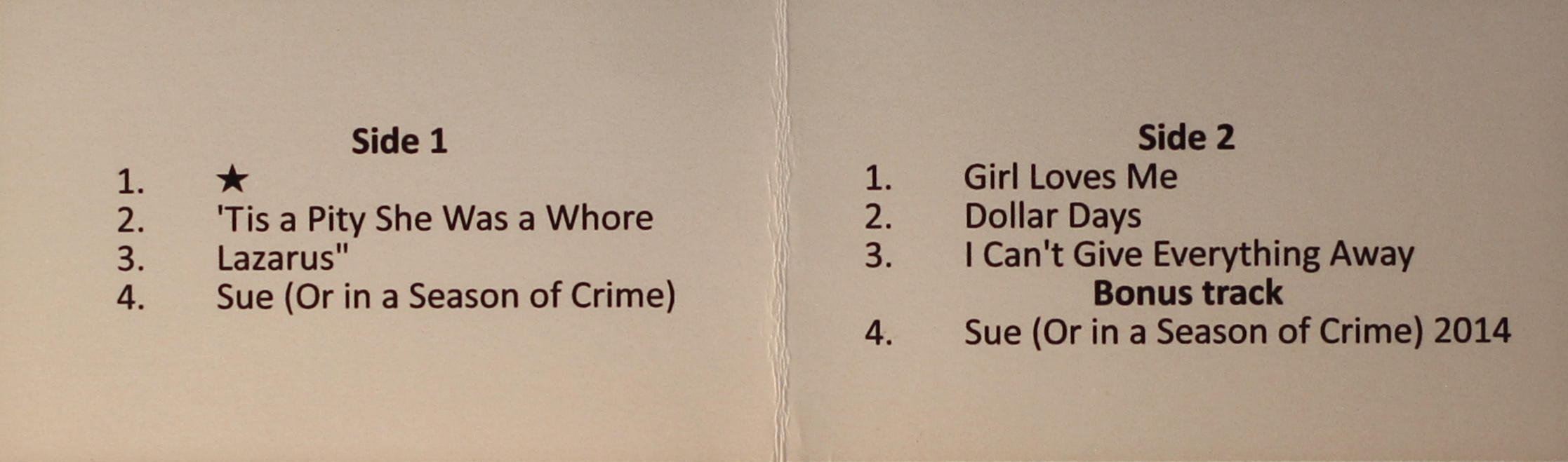 Side 2: Girl Loves Me; Dollar Days; I Can’t Give Everything Away; Sue (Or In A Season Of Crime) (2014 version, bonus track).
