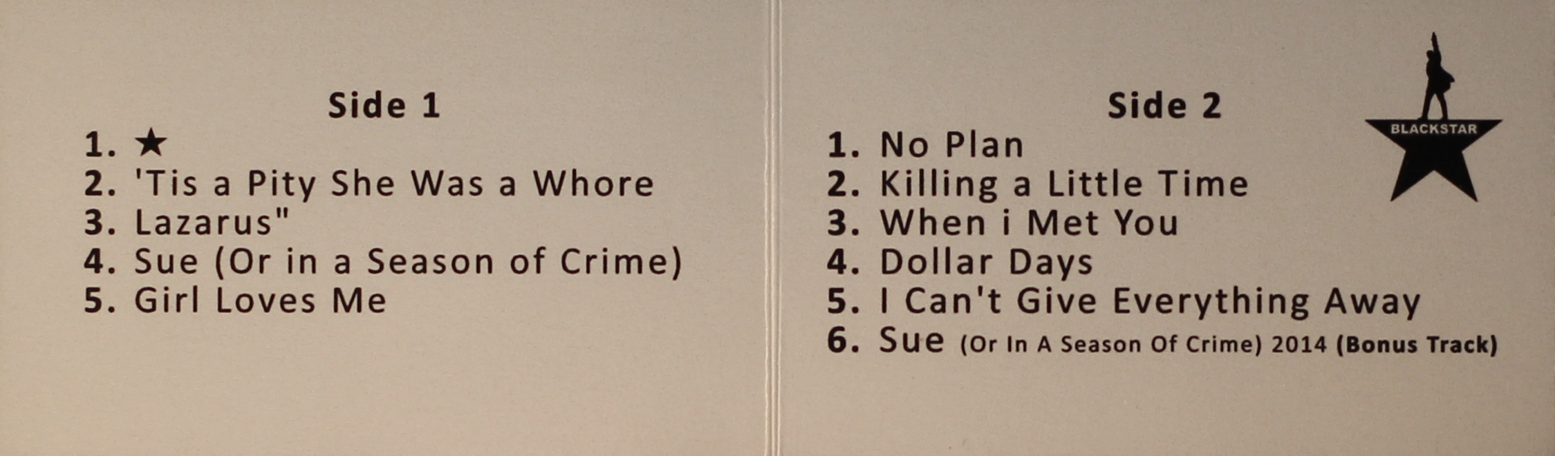 Side 1: Blackstar; ‘Tis A Pity She Was A whore; Lazarus; Sue (Or In A Season Of Crime); Girl Loves Me.