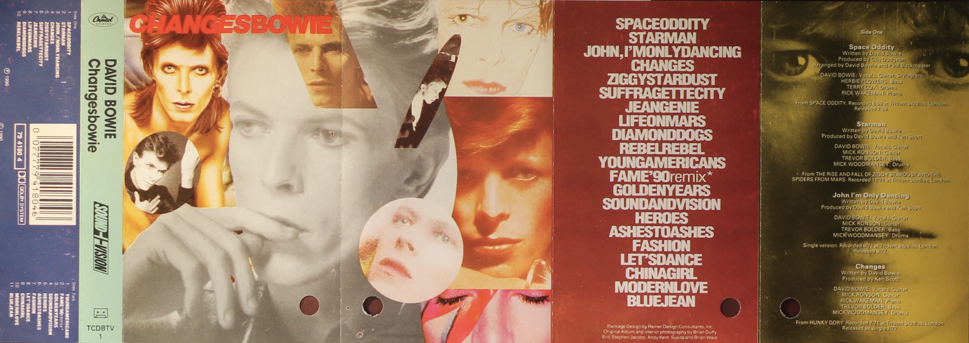 Side 2: Young Americans; Fame ’90 (remix); Golden Years; Sound And Vision; Heroes; Ashes To Ashes; Fashion; Let’s Dance; China Girls; Modern Love; Blue Jean.