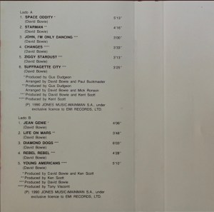 Side 2: Jean Genie; Life On Mars; Diamond Dogs; Rebel Rebel; Young Americans.