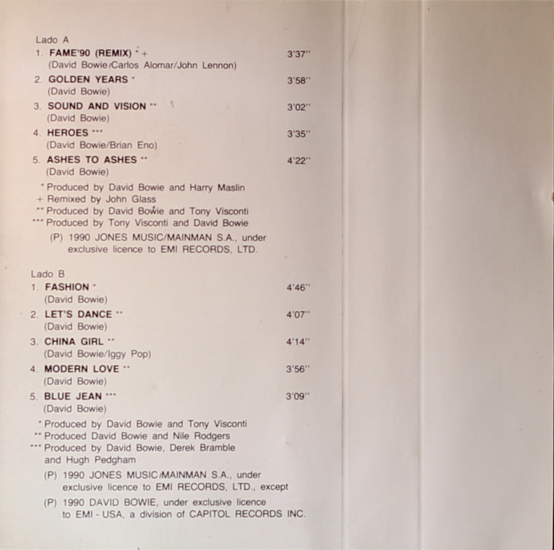 Side 1: Fame ’90 (remix); Golden Years; Sound And Vision; Heroes; Ashes To Ashes.