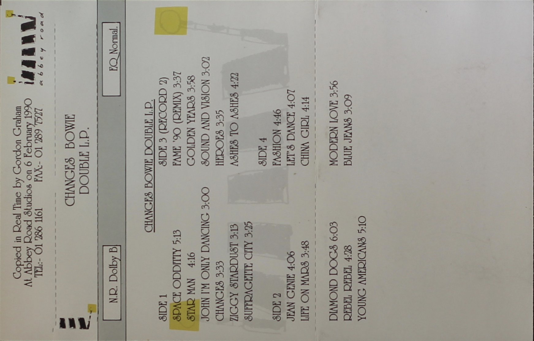 Side 2: Young Americans; Fame ’90 (remix); Golden Years; Sound And Vision; Heroes; Ashes To Ashes; Fashion; Let’s Dance; China Girls; Modern Love; Blue Jean.