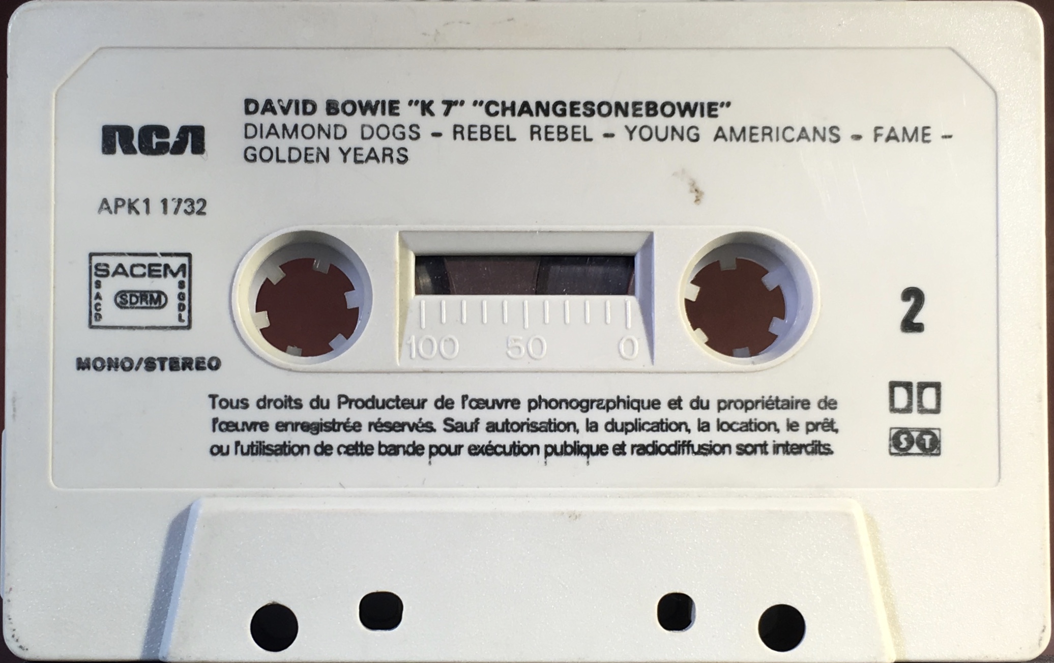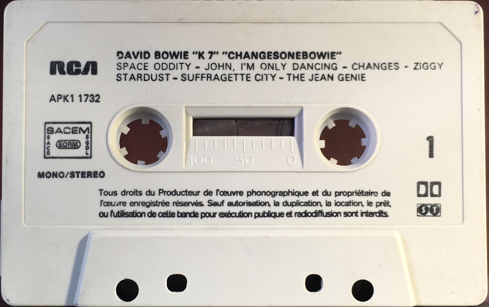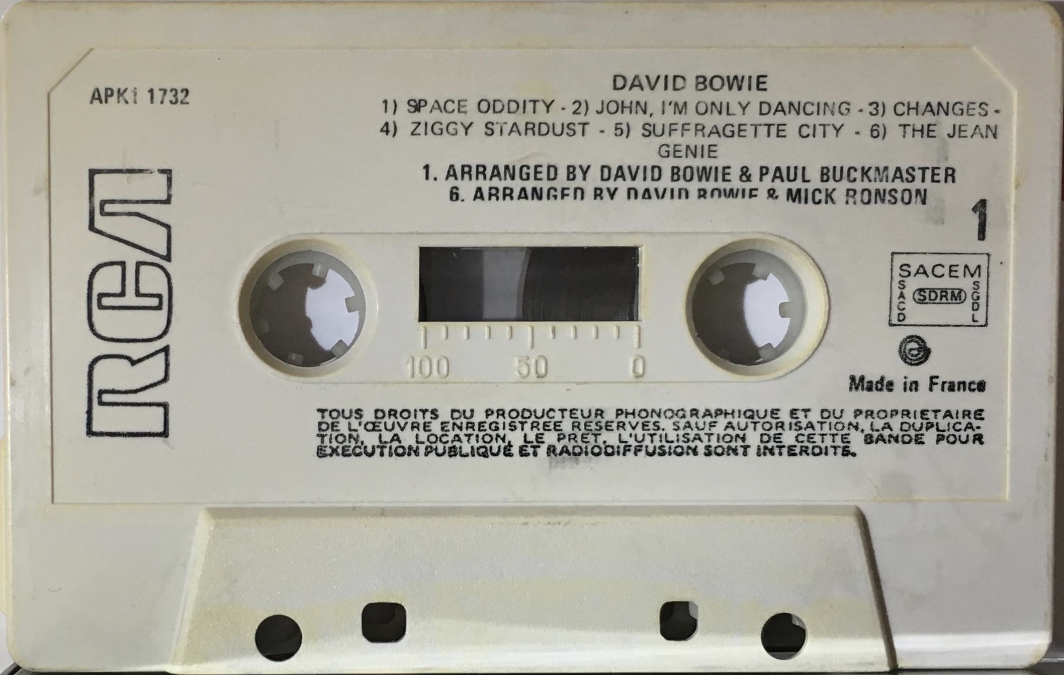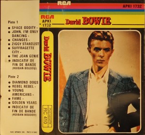 Cover is a green panel with tracks on it and a red border; yellow spine with red top and yellow rear half-panel on thick, treated and folded paper. The rear has the track list and care information. Price Code RC 410 on lower spine. Track list in English with information in French. Unusually the sides end with a short musical piece by Huiban – Boudou. This is credited to them on the track list. ‘Indicatif de fin de bande’. Despite having ‘Space Oddity’ in the title space on the spine it is the same Changesonebowie cassette as the other two examples.