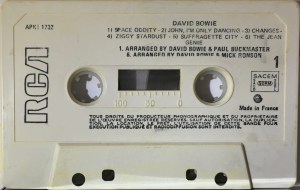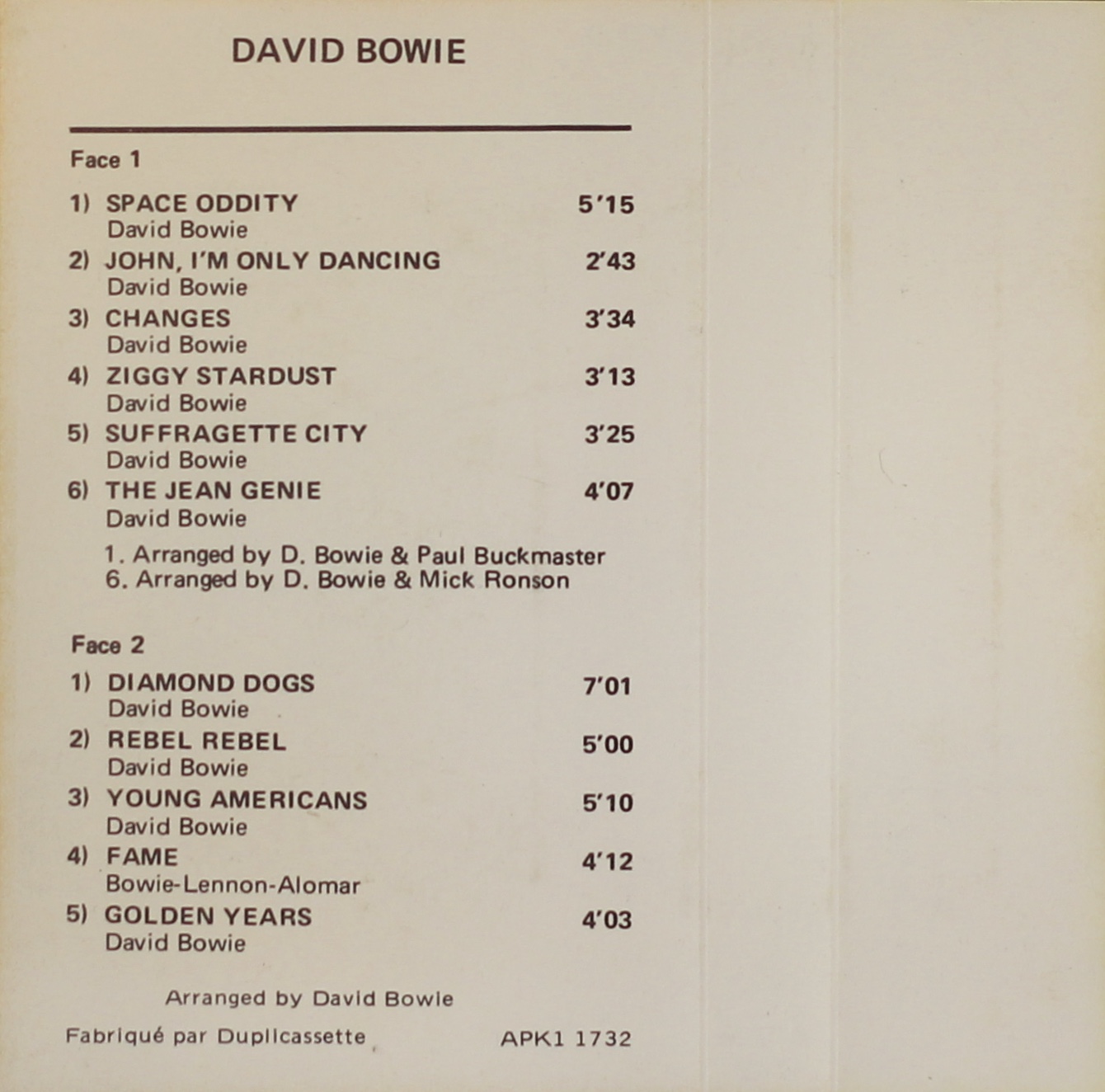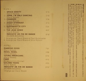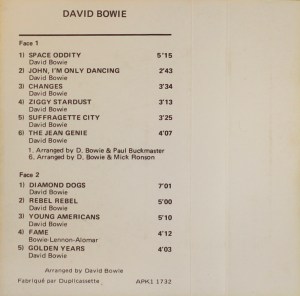 Side 1: Space Oddity; John, I’m Only Dancing; Changes; Ziggy Stardust; Suffragette City; The Jean Genie.