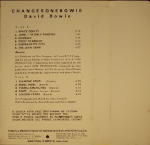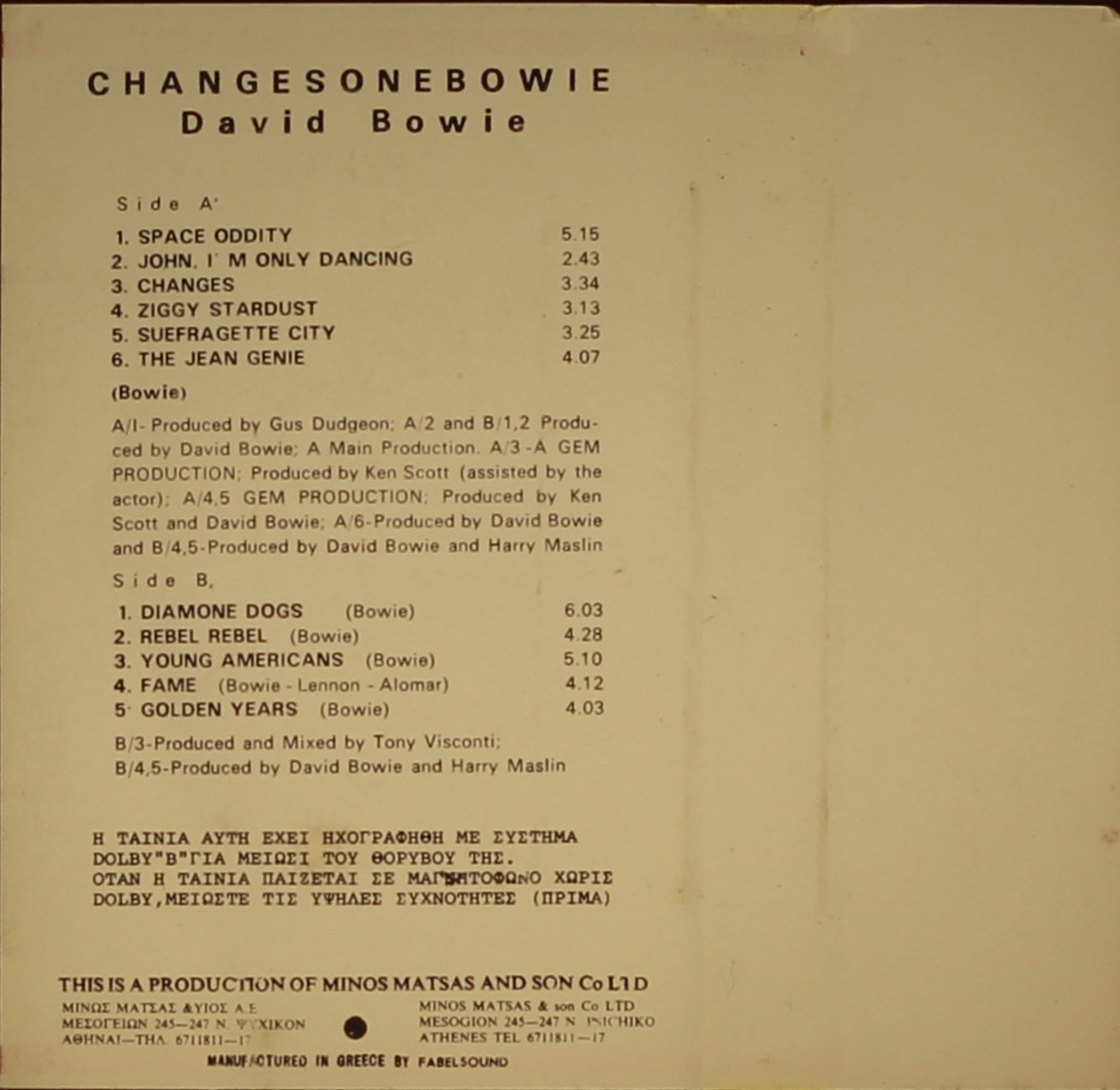 Side 1: Space Oddity; John, I’m Only Dancing; Changes; Ziggy Stardust; Suffragette City; The Jean Genie.