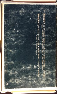 Cover photo bordered in purple with black header, footer, and side. Black spine and rear panels with track list on rear panel and blank white inner panel. Perforated and treated thick paper. Barcode on rear, track list on front.