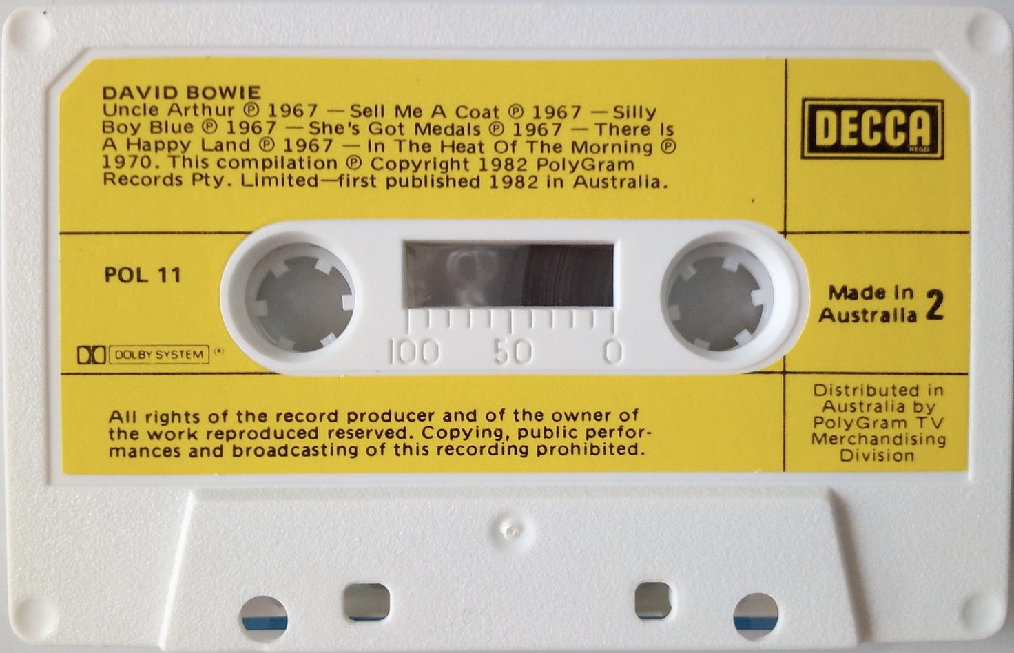 Black ink printed on yellow paper label onto white shell; or black ink printed on white paper label onto white shell. ‘Made In Australia’ and ‘Distributed in Australia by PolyGram TV Merchandising Division’.