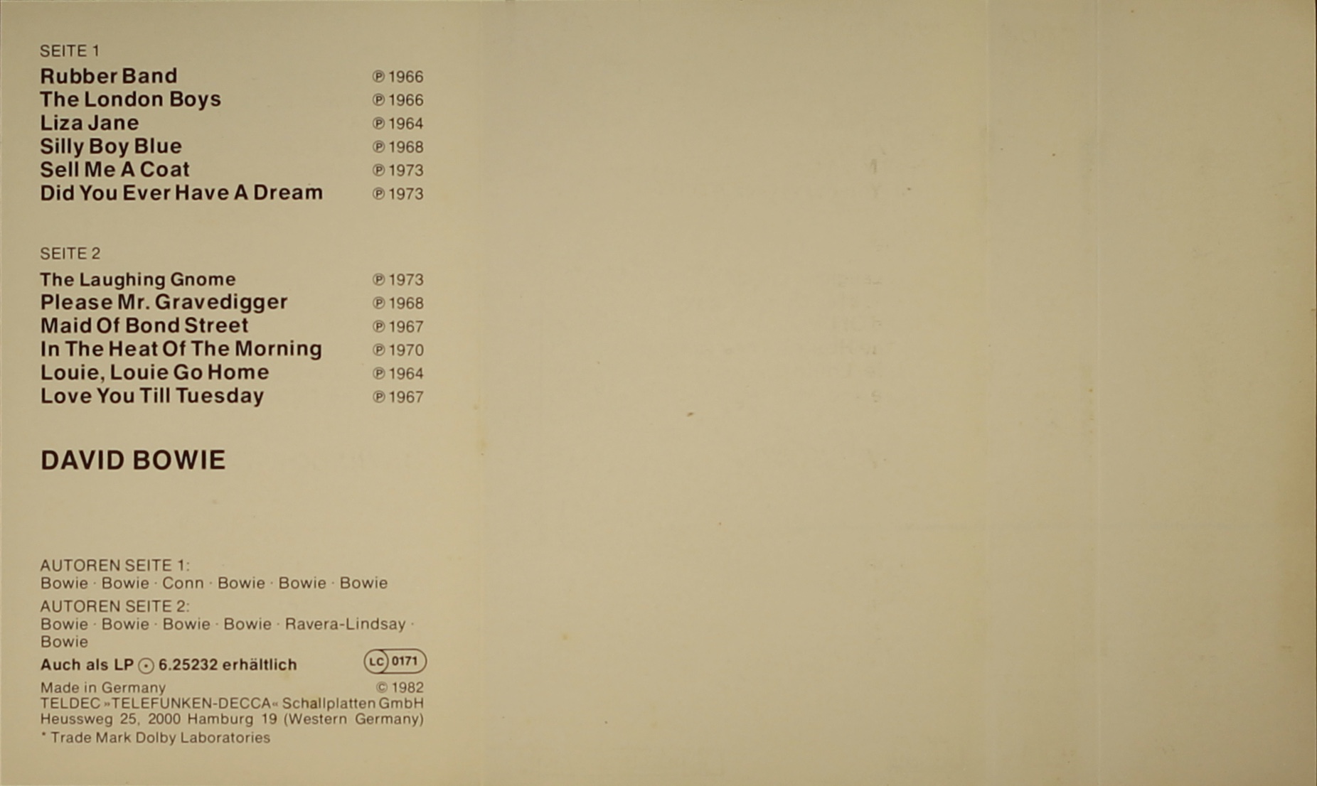 Side 2: The Laughing Gnome; Please Mr Gravedigger; Maid Of Bond Street; In The Heat Of The Morning; Louie, Louie Go Home; Love You Till Tuesday.