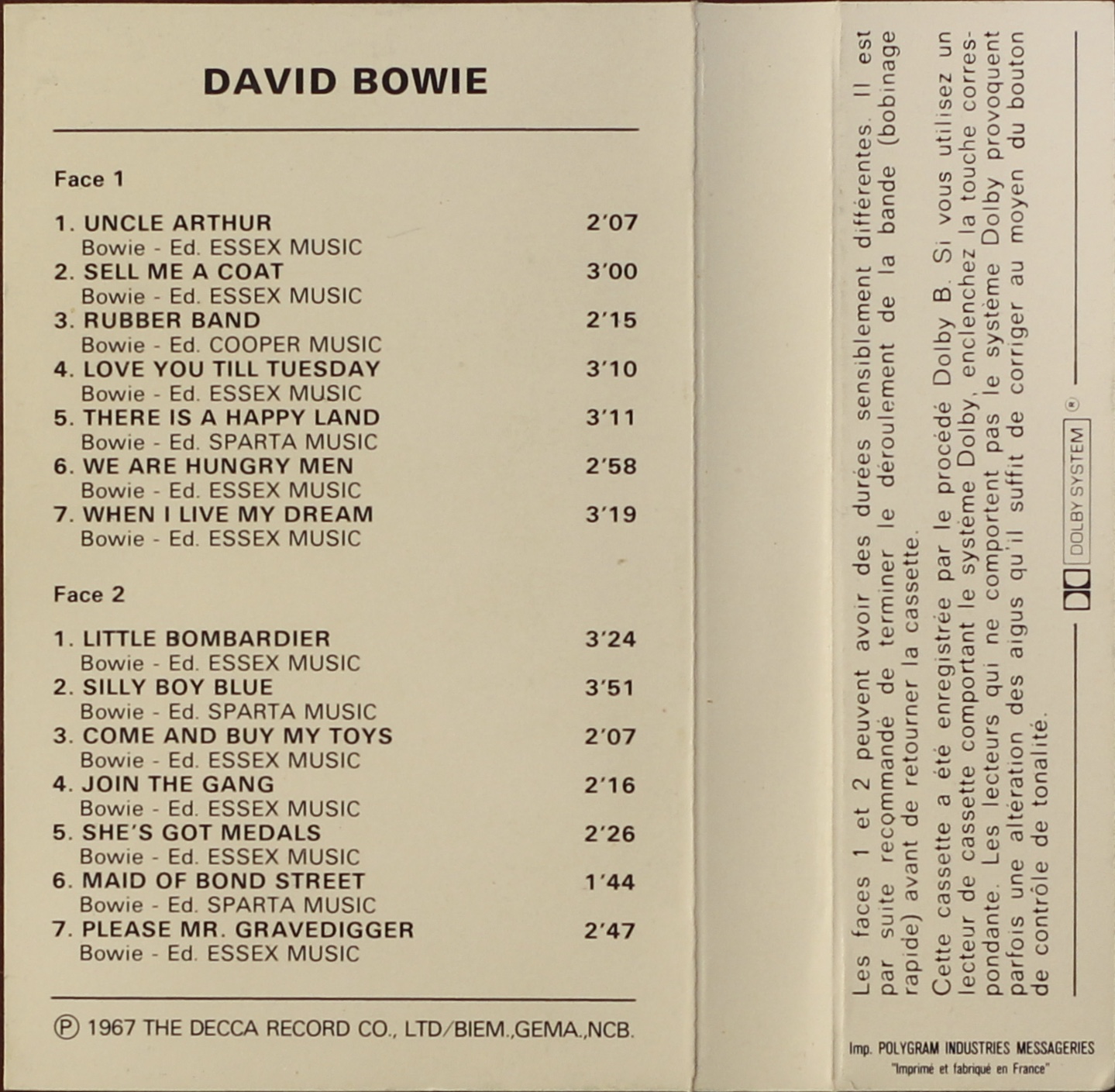 Side 2. When I Live My Dream; Come And Buy My Toys; Join The Gang; She’s Got Medals; Maid Of Bond Street; Please Mr. Gravedigger.