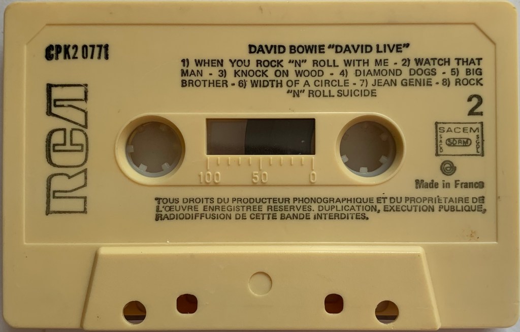 Side 2: When You Rock ‘n’ Roll With Me; Watch That Man; Knock On Wood; Diamond Dogs; Big Brother; Width Of A Circle; Jean Genie; Rock ‘n’ Roll Suicide.