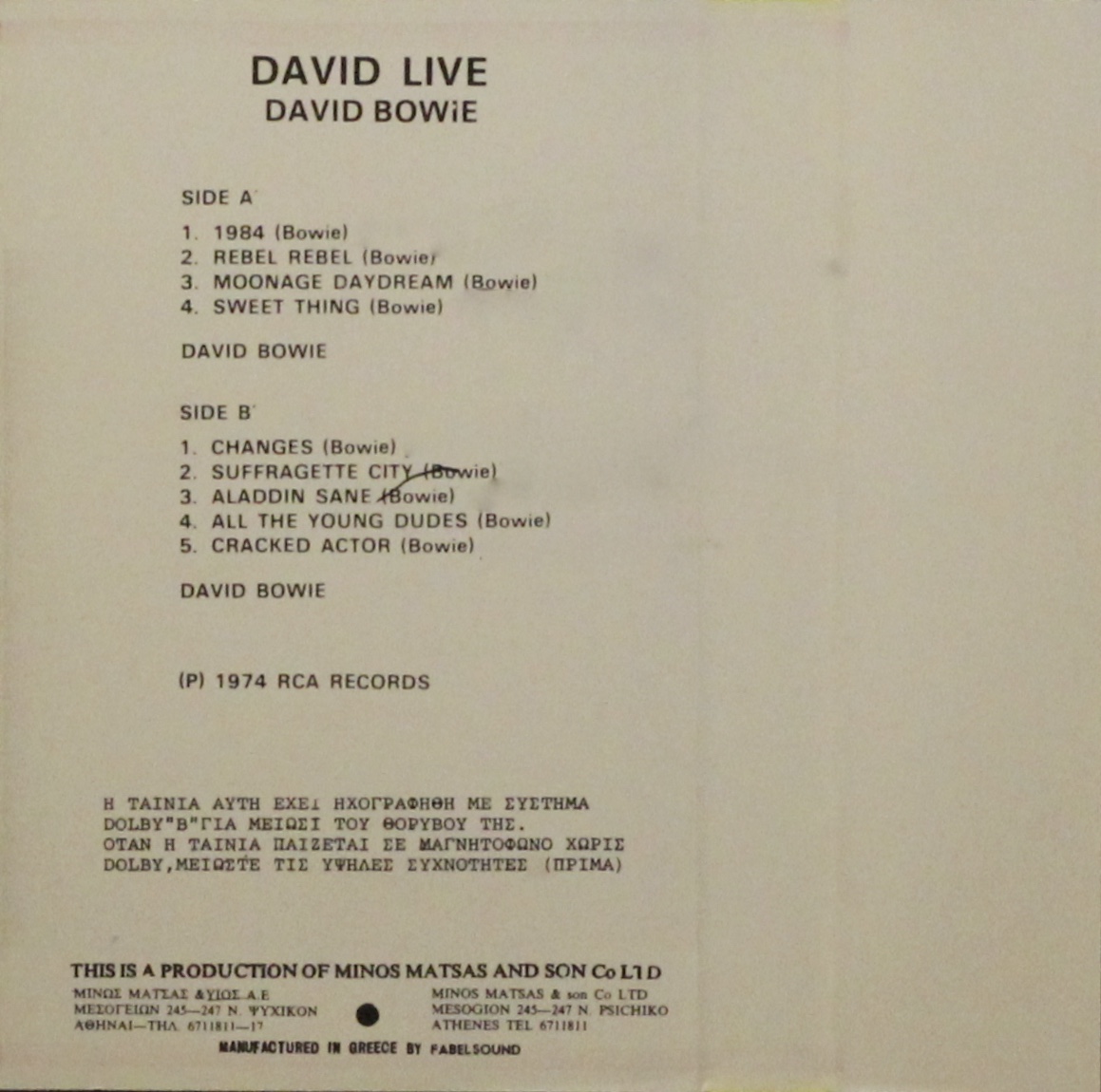 David Live: Greece; RCA Victor; CI-TC- RCLP 20263/ 4.