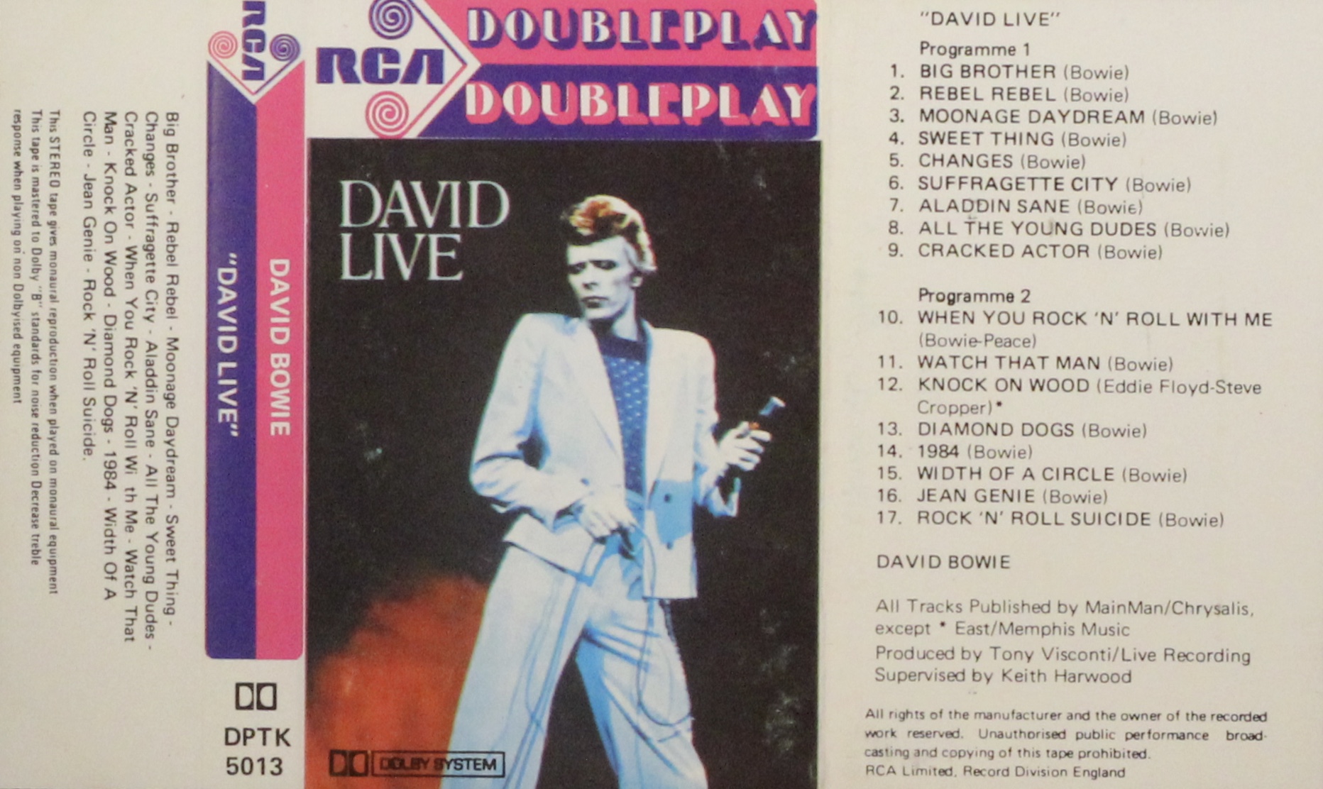 Side 2: When You Rock ‘n’ Roll With Me; Watch That Man; Knock On Wood; Diamond Dogs; 1984; Width Of A Circle; Jean Genie; Rock ‘n’ Roll Suicide.