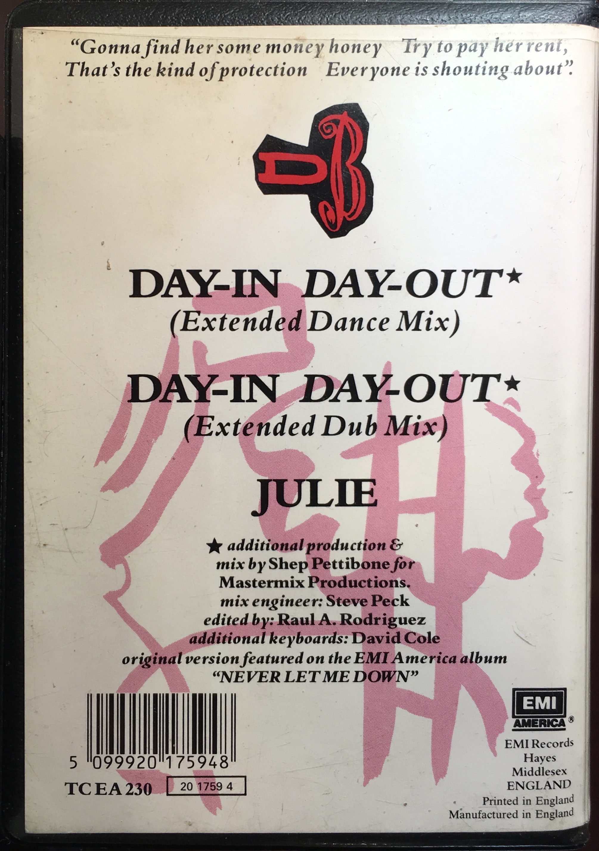 Side 2: Day-in Day-out (extended dance mix)(7:15); Day-in Day-out (extended dub mix)(7:15); Julie.