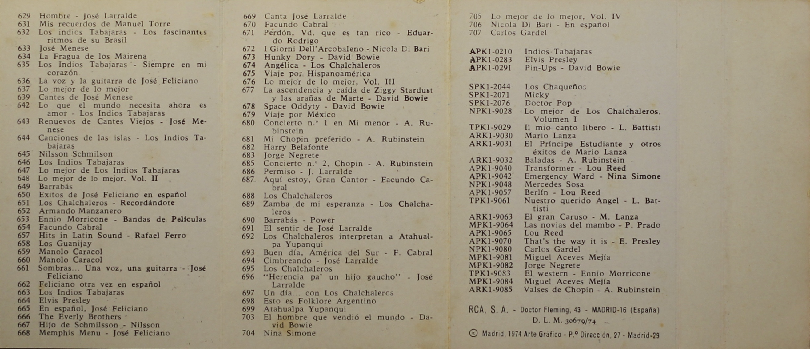 Track list on the rear tab and inner cover. The inside cover gives the date of 1983. The cover is folded, glossy paper with perforated edges. The cover states Cara A & B for the sides but the cassette shows 1 & 2.
