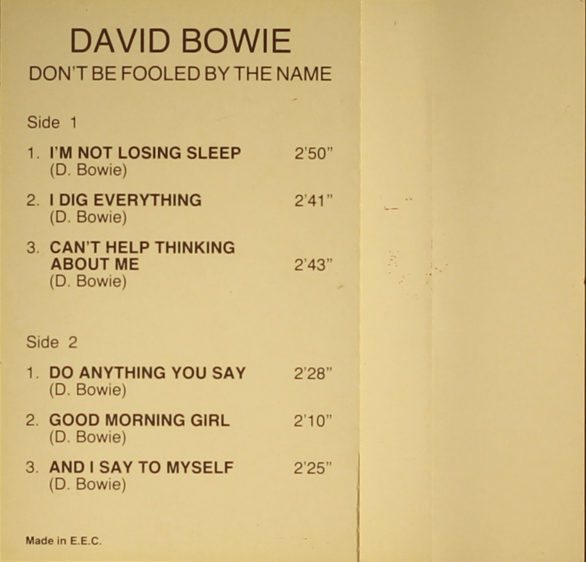 Side 1: I’m Not Losing Sleep; I Dig Everything; Can’t Help Thinking About Me.