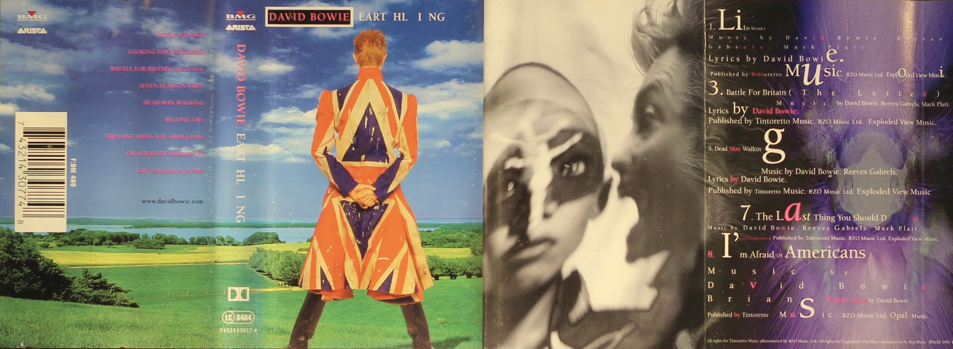 Concertina style cover on thick, glossy, folded paper with full frame photo on front, spine and rear panel. Album artwork incorporating track and personnel information printed over the remaining six inner and eight rear panels. This is the standard EU Earthling cover with all the manufacturing information blanked out and a BMG Music Thailand sticker on case