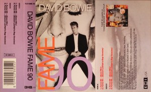 Full picture cover and inner panel with purple spine and rear panel on from folded, treated thick paper. The rear of the cover is peach in colour. Track list on rear and inner panels. The timings are Fame ’90; 3:36, and Fame ’90 (featuring Queen Latifah) 3:10.