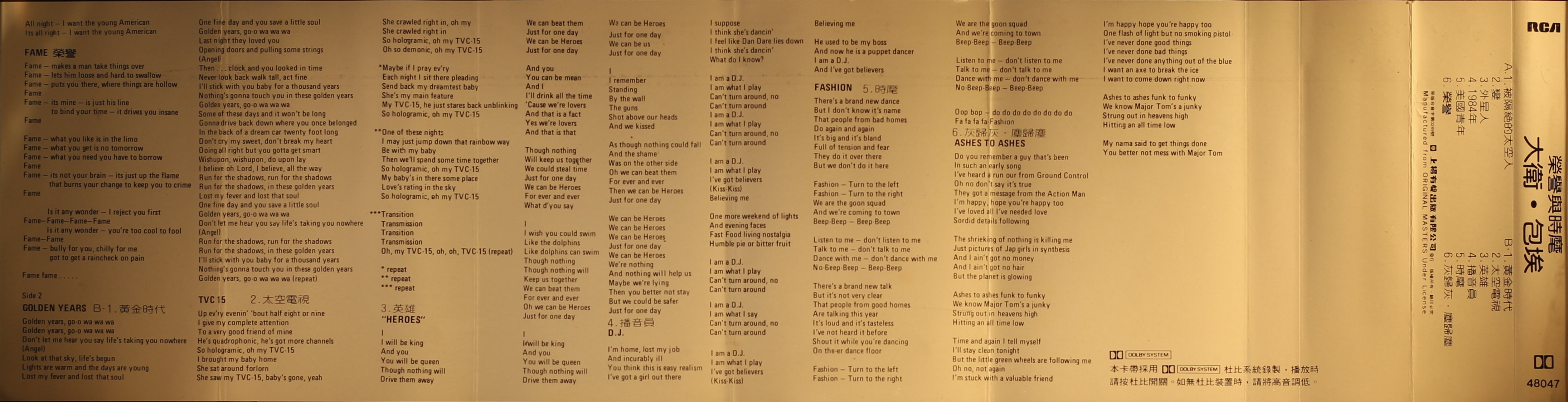 Side 2: Golden Years; TVC 15; “Heroes”; D.J.; Fashion; Ashes To Ashes.