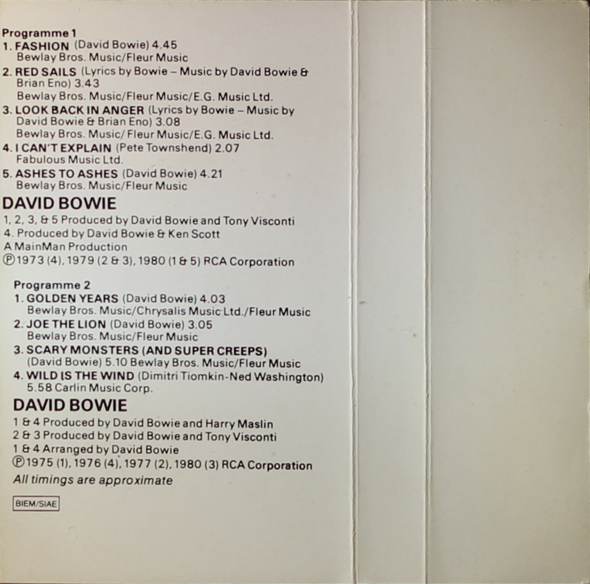 Side 2: Golden Years; Joe The Lion; Scary Monsters (and super creeps); Wild Is The Wind.