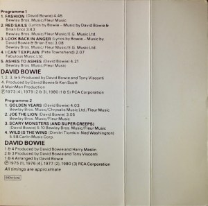 Side 1: Fashion; Red Sails; Look Back In Anger; I Can’t Explain; Ashes To Ashes.