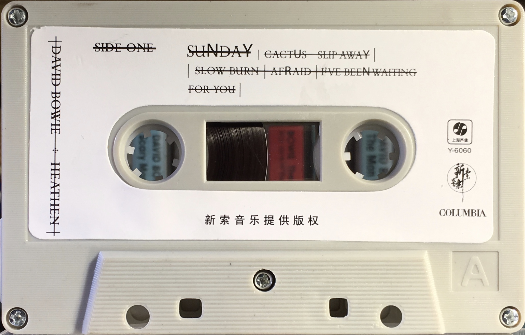 Black ink printed onto white paper label on grey shell with Columbia and Shanghai Audio-Visual Press logos. Titles in English in Barnbrook’s ‘Priori’ typeface.
