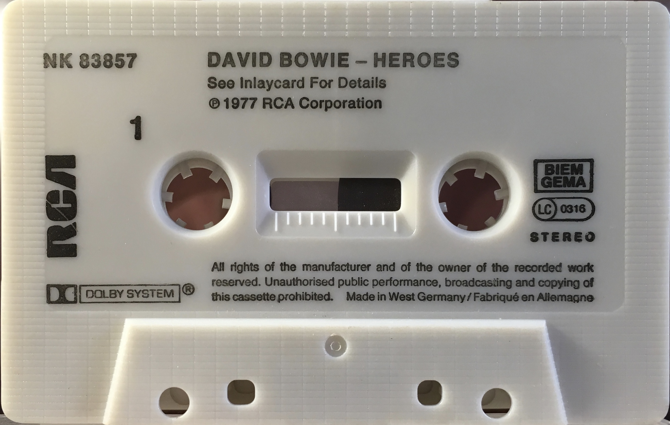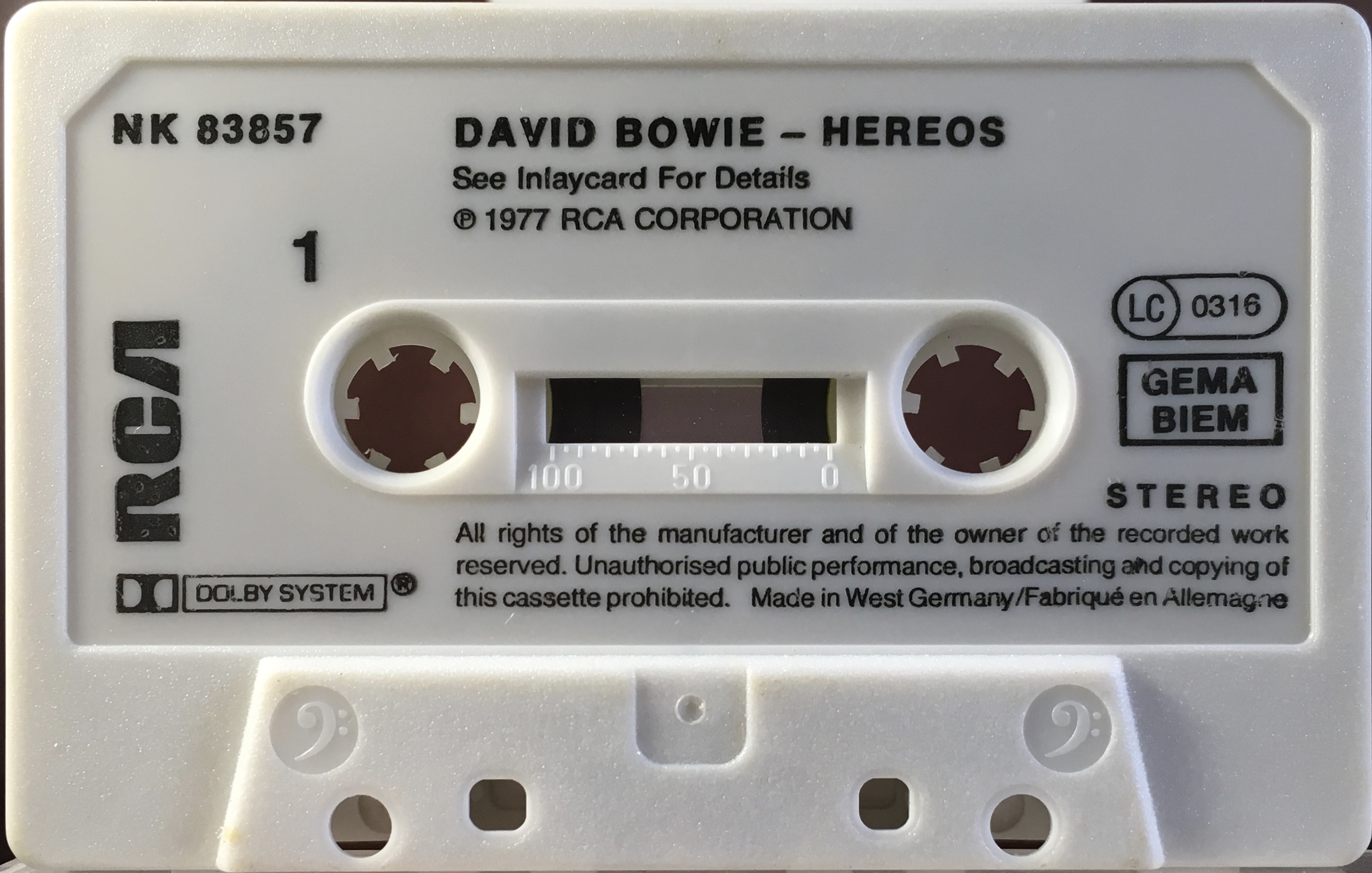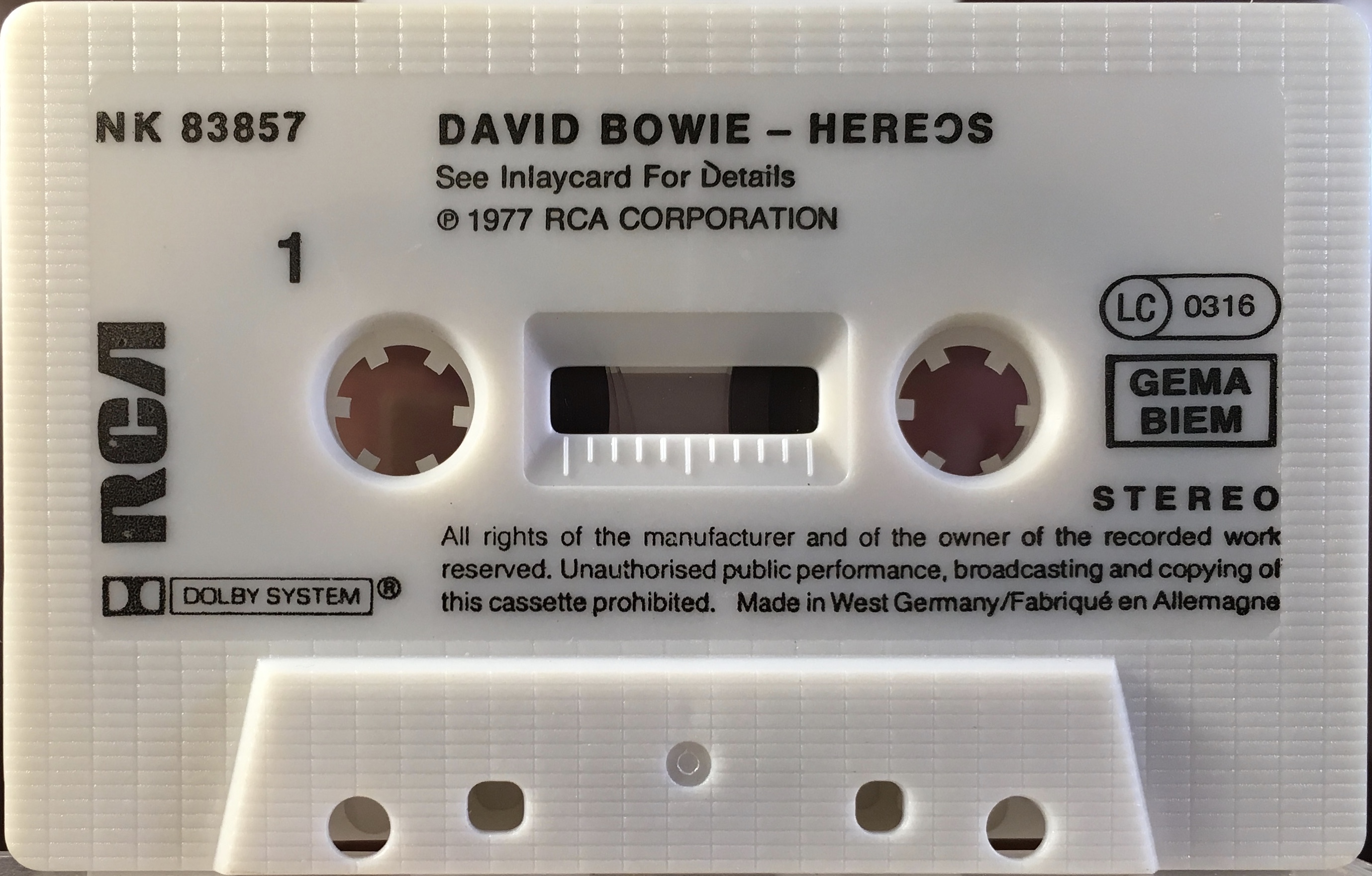 Black ink printed directly onto white shell. The mechanical rights society ‘GEMA’ appears above ‘BIEM’ (German copyright collection agency) on the cassette. There are variants for the cassette itself. The title is mis-spelled as “Hereos”