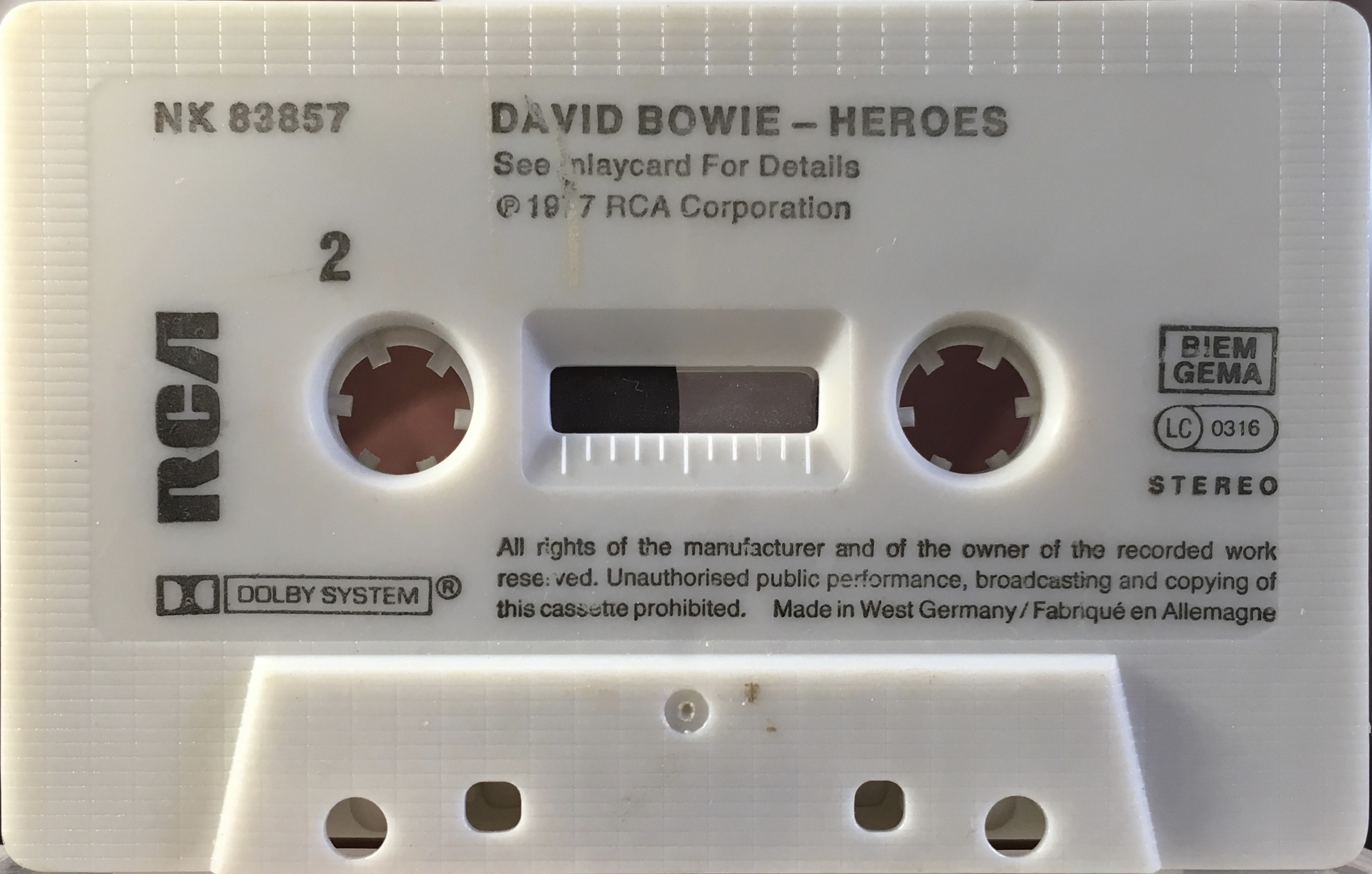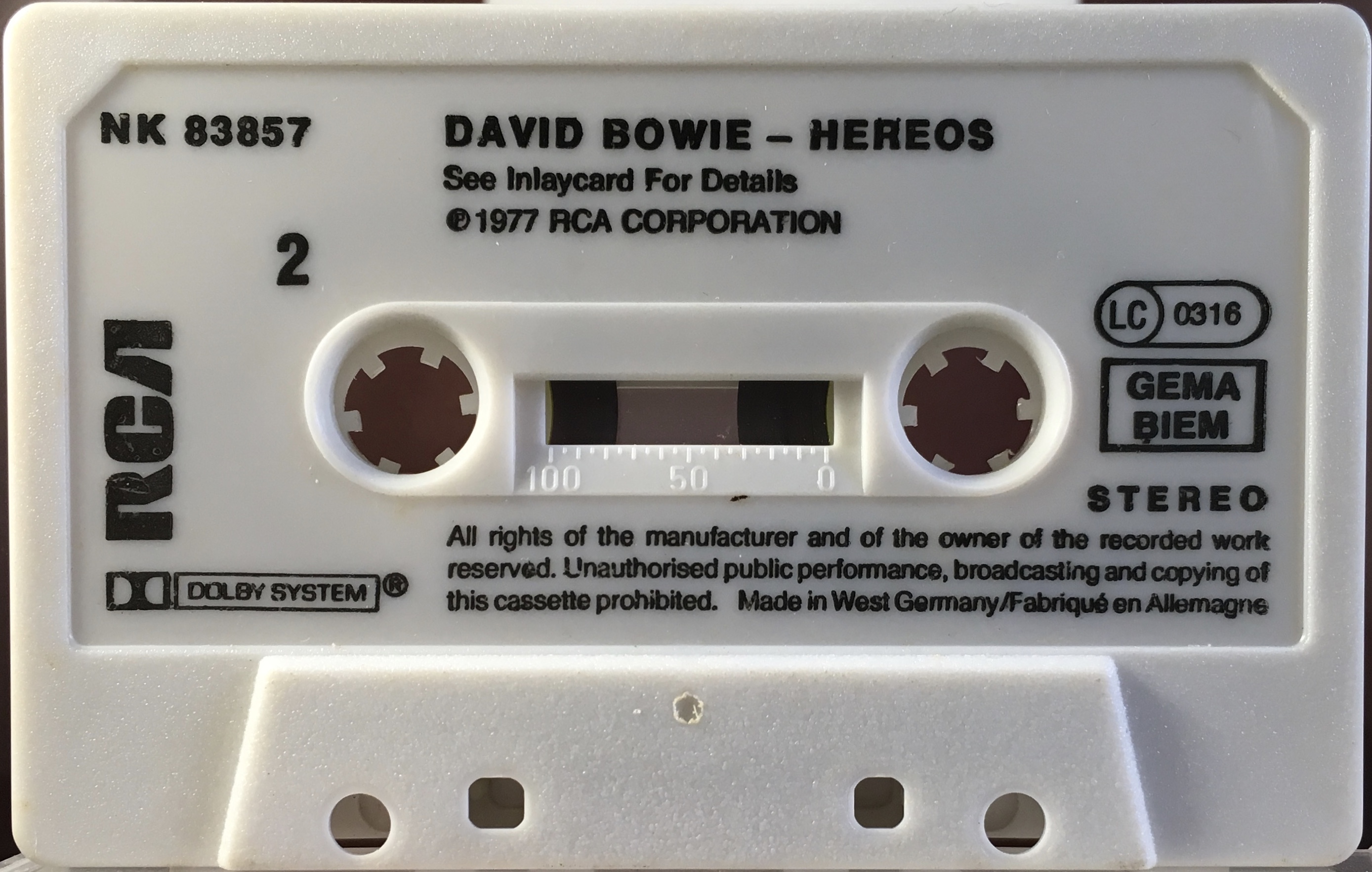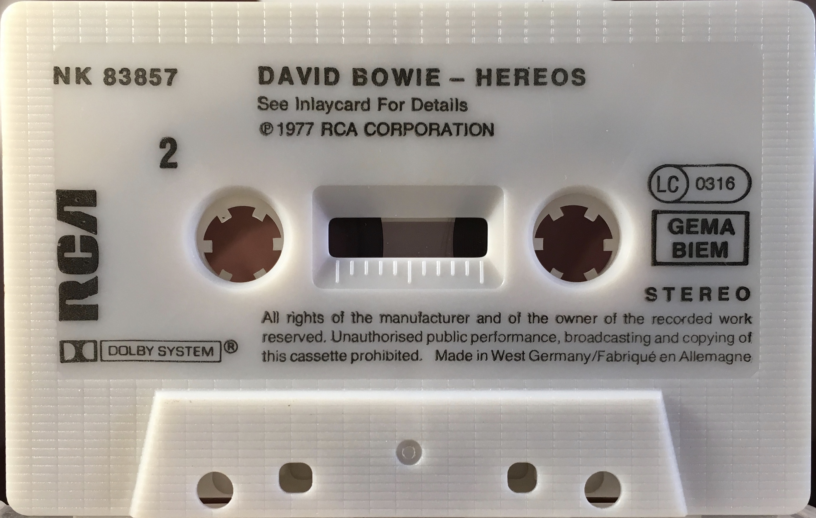Black ink printed directly onto white shell. The mechanical rights society ‘GEMA’ appears above ‘BIEM’ (German copyright collection agency) on the cassette. There are variants for the cassette itself. The title is mis-spelled as “Hereos”