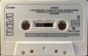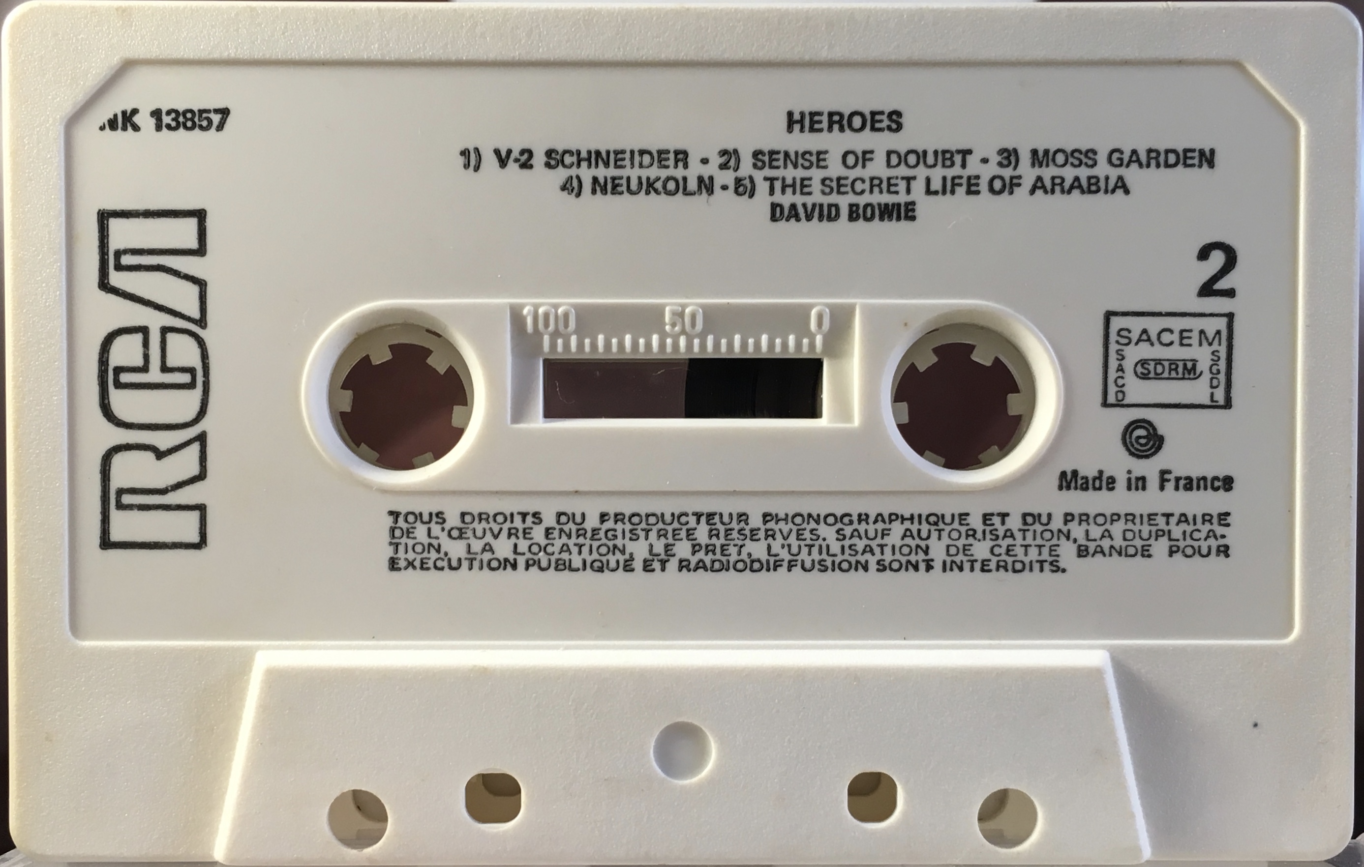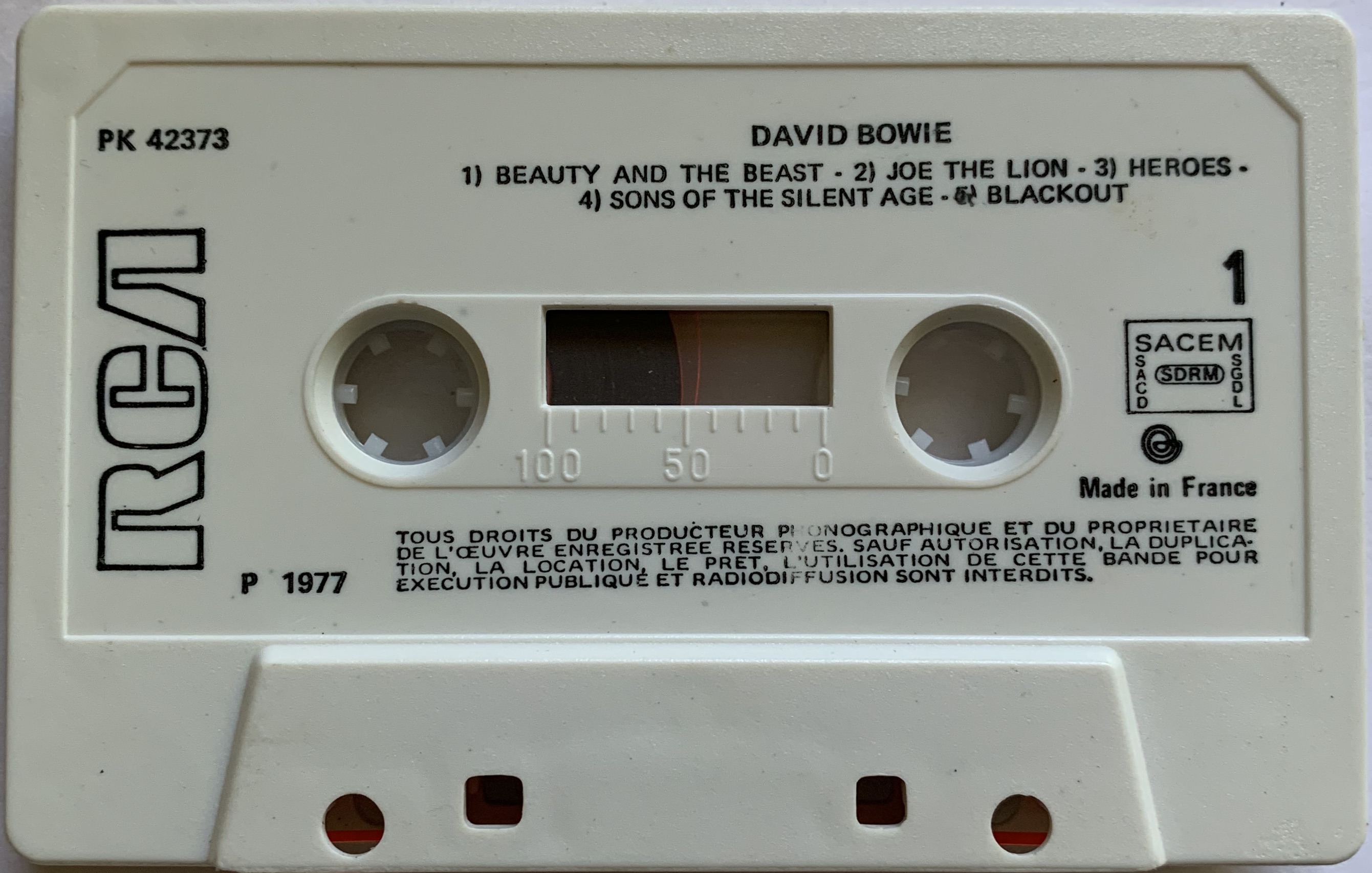 Titles are in English. The copyright information on both sides is in French, the cassette is stamped with ‘SACEM’ rights stamp.